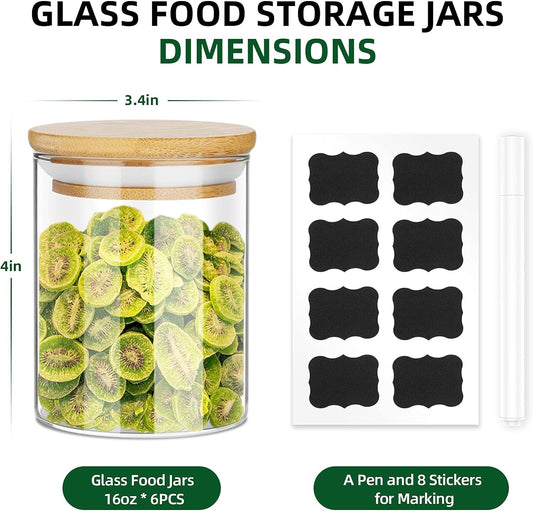 16Oz Glass Jars for Food Storage, Airtight Food Containers with Bamboo Wooden Lids Kitchen Canisters for Sugar,Candy, Cookie, Rice and Spice Jar(Set of 6)