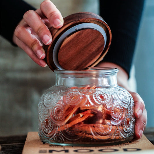 Glasgefäß mit geschnitztem Holzdeckel im Retro-Stil