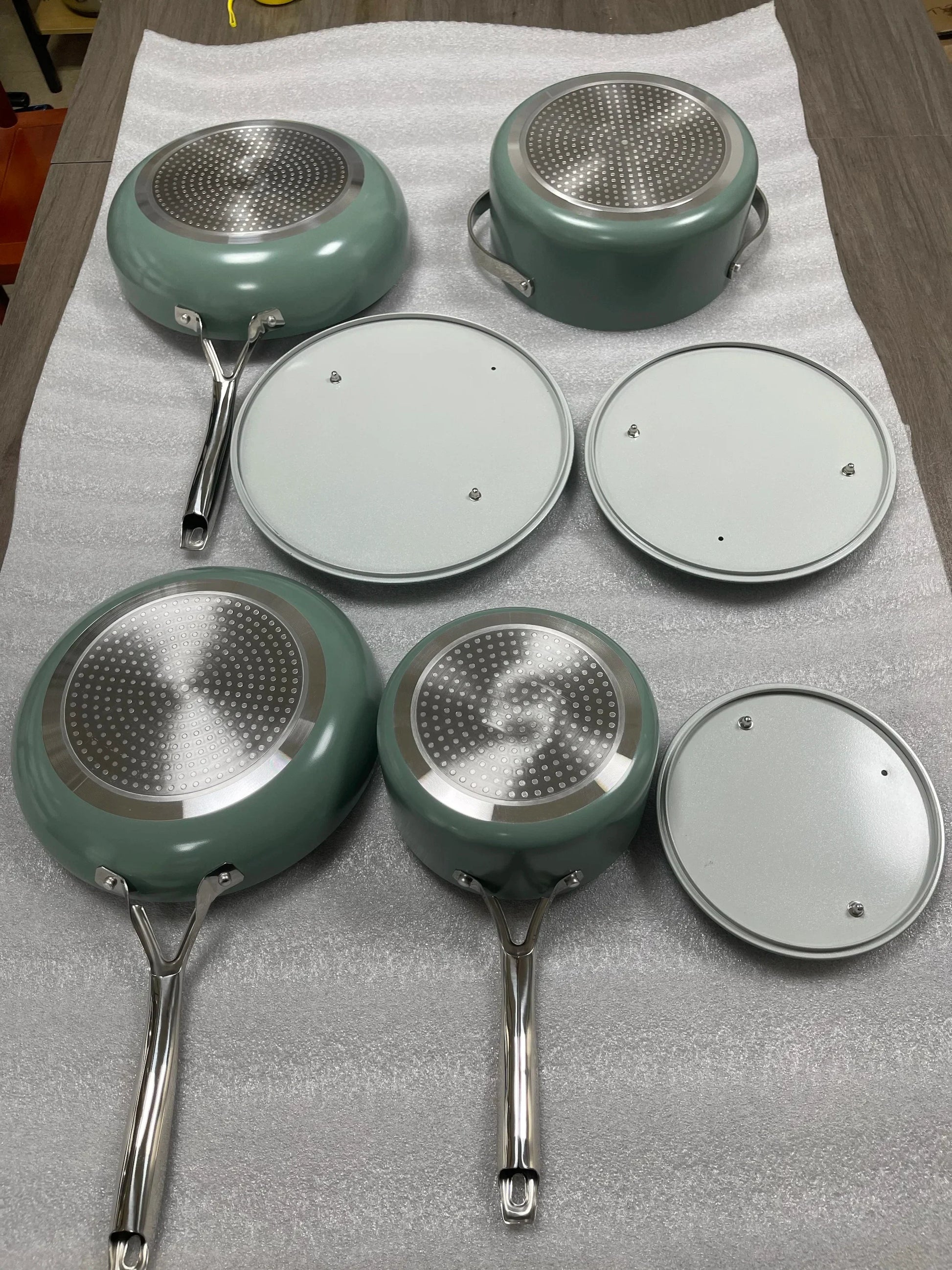 Dieses vielseitige Kochgeschirrset ist sowohl mit Gas- als auch mit Induktionskochfeldern kompatibel und sorgt für perfektes Kochen, egal auf welchem ​​Herd Sie kochen. Die Aluminiumdeckel speichern die Wärme effizient, während die Edelstahlgriffe einen sicheren, komfortablen Griff für eine sichere Handhabung bieten.