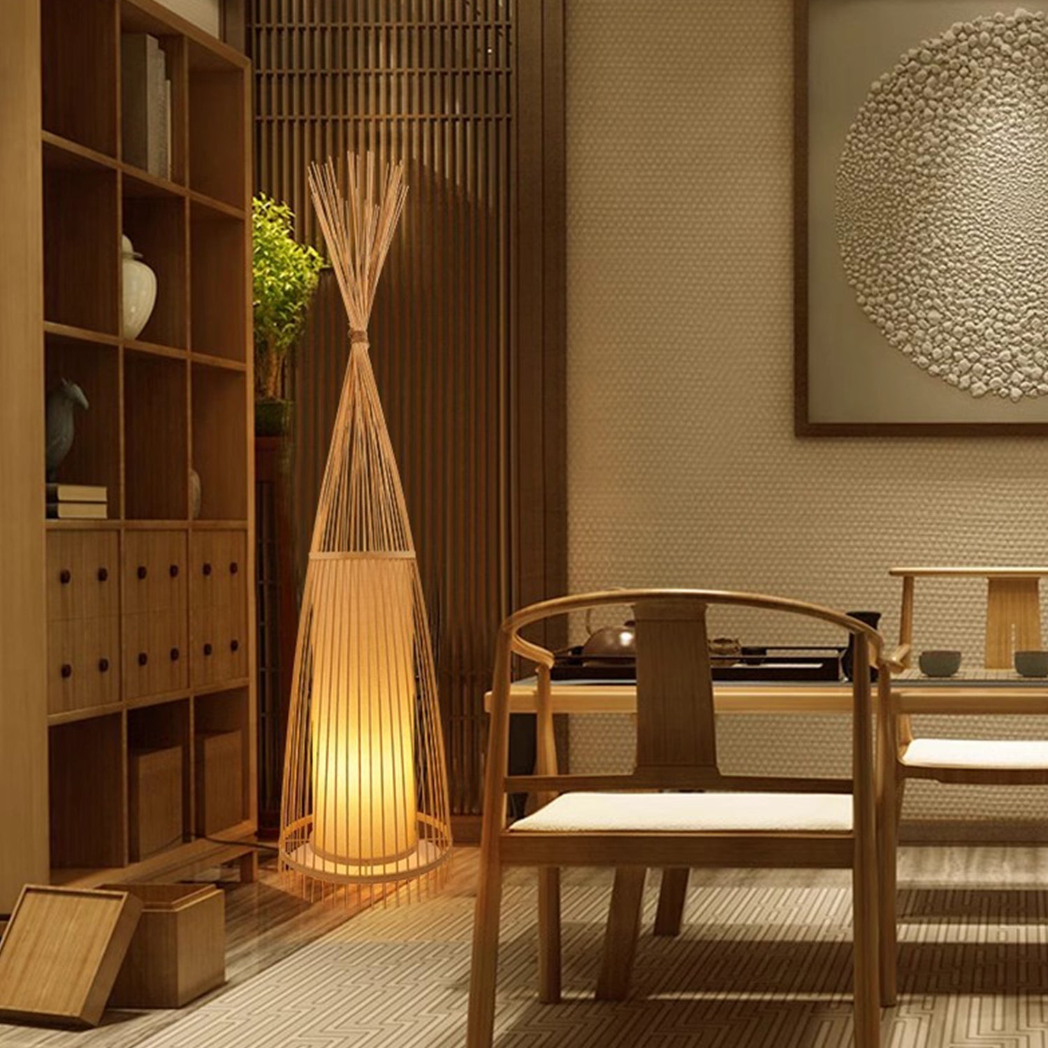 Unsere Stehlampe, handgefertigt aus nachhaltigem Bambus und Rattan/Weide, verkörpert zeitlose Eleganz. Inspiriert von traditionellem chinesischem Design, besticht sie durch zarte Flechtmuster und einen warmen, natürlichen Farbton. Die organischen Materialien schaffen eine beruhigende Atmosphäre und tauchen Ihren Raum in sanftes Licht. Diese Stehlampe ist perfekt, um jedem Wohn- oder Aufenthaltsraum einen Hauch von Ruhe zu verleihen und zeugt von Handwerkskunst und kulturellem Erbe.