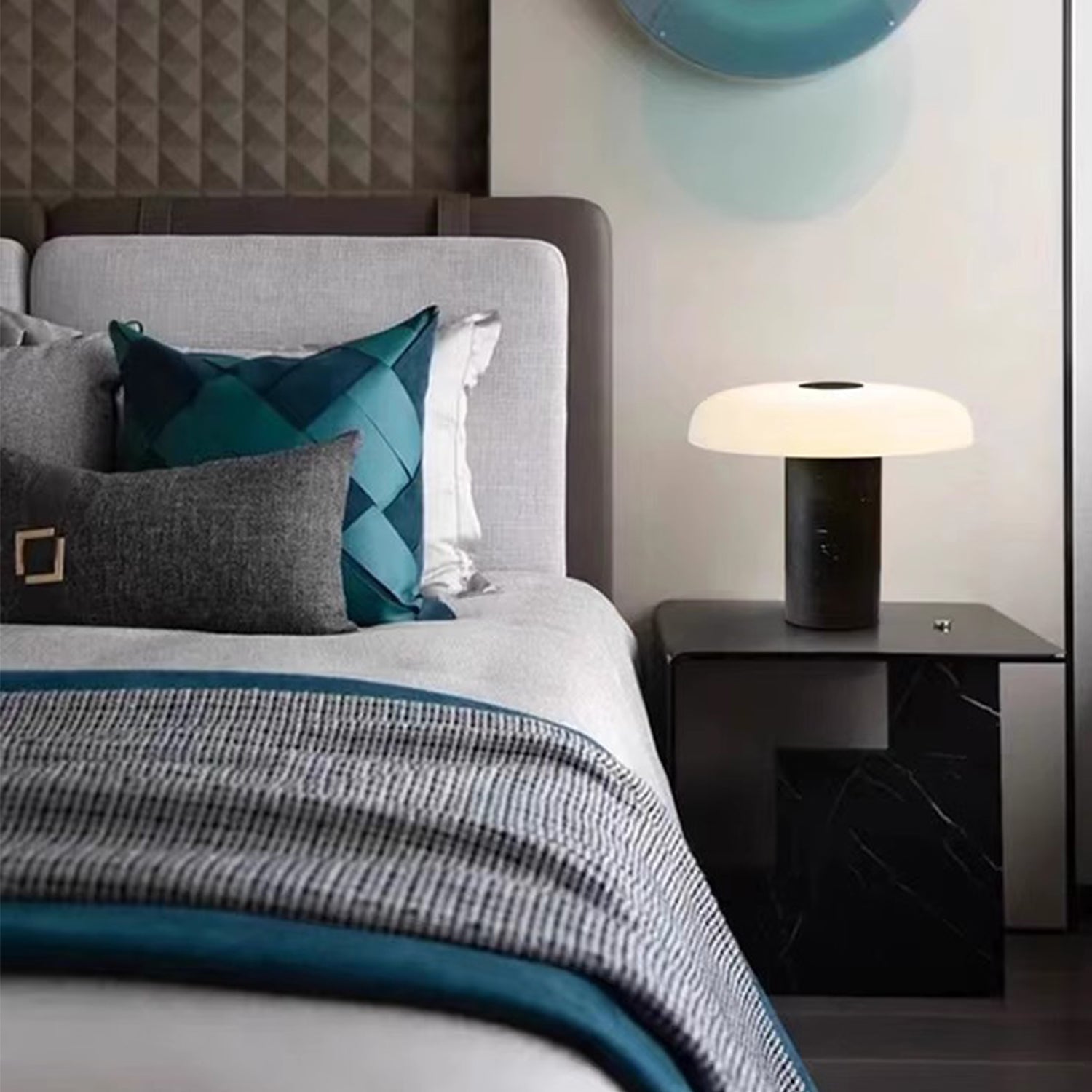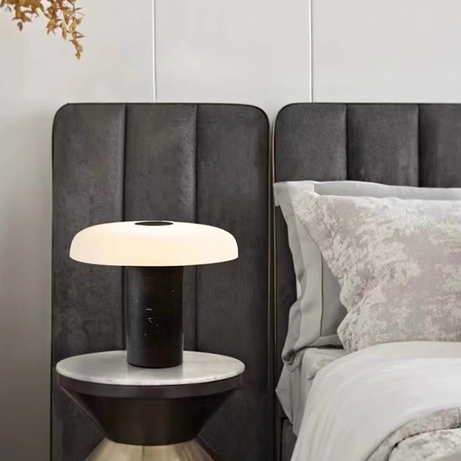 Verleihen Sie Ihren gemütlichen Abenden mit unserer Tischleuchte CHRIS ein behagliches Ambiente. Der elegante, breite Lampenschirm ruht auf einem massiven Marmorsockel. Genießen Sie eine Ausleuchtung von bis zu 25 m² mit dieser charmanten und zugleich stilvollen Leuchte. Wählen Sie zwischen kühlem Schwarz und Perlweiß, passend zu Ihrem modernen, minimalistischen oder zeitgenössischen Schlafzimmer oder Büro.