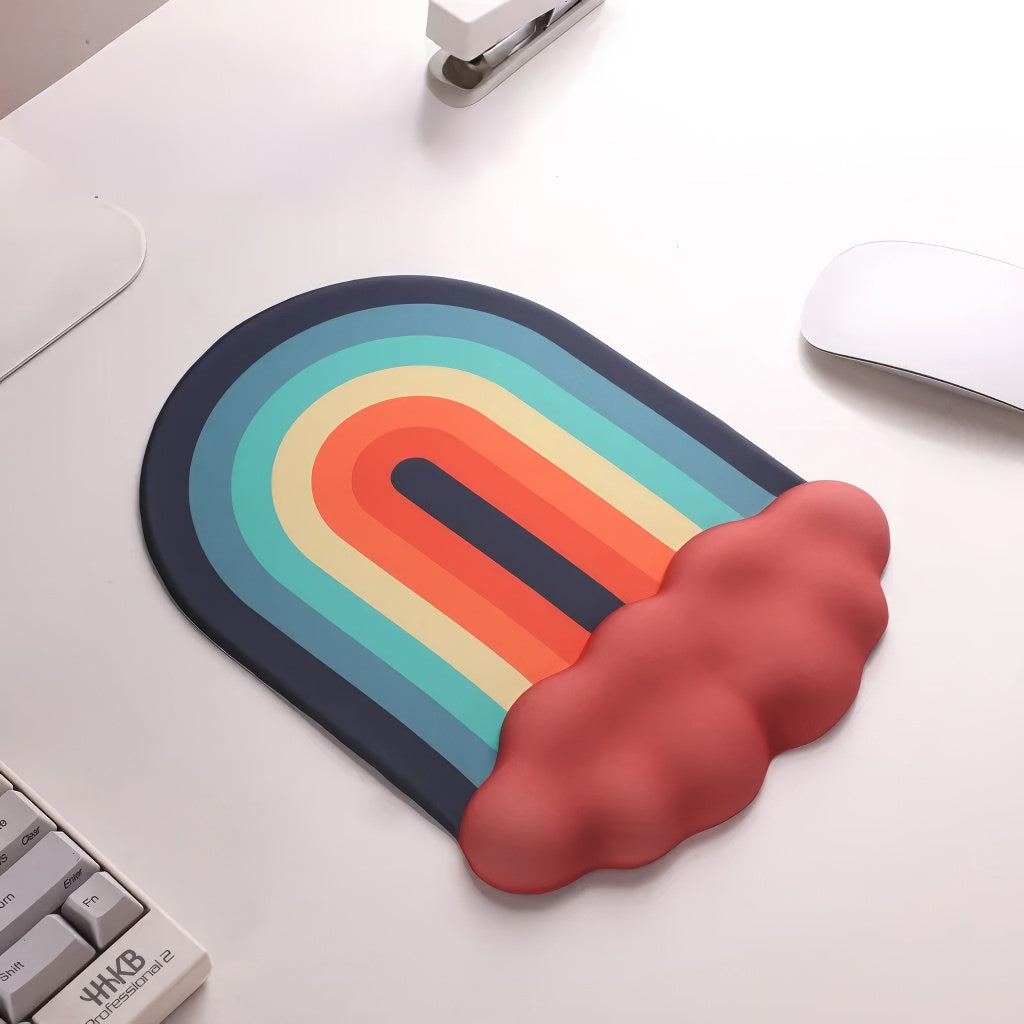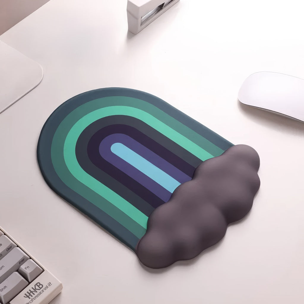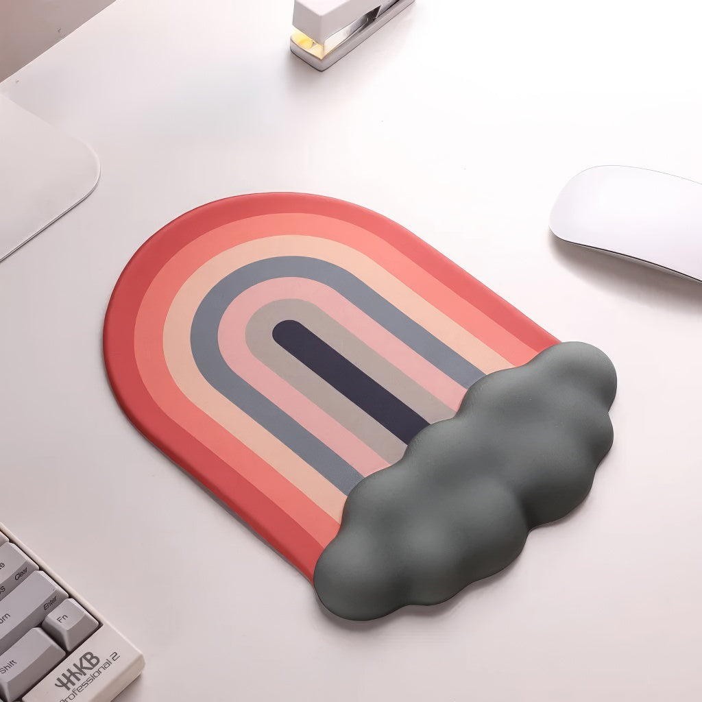Diese Regenbogen-Handgelenkauflage verleiht jedem Arbeitsplatz eine farbenfrohe und verspielte Note. Das Design zeigt einen weichen, geschwungenen Regenbogen, der an beiden Enden von flauschigen weißen Memory Foam-Wolken gehalten wird. Die ergonomische Handgelenkauflage ist mit ihrer weichen, gepolsterten Textur auf Komfort ausgelegt. Das passende Mauspad spiegelt den gleichen Regenbogenbogen wider und sorgt so für eine einheitliche, auffällige Ästhetik. Dieses Set passt gut zu Indie- oder Kawaii-Schreibtisch-Setups und verleiht Ihrem Arbeitsplatz Charme und Persönlichkeit.