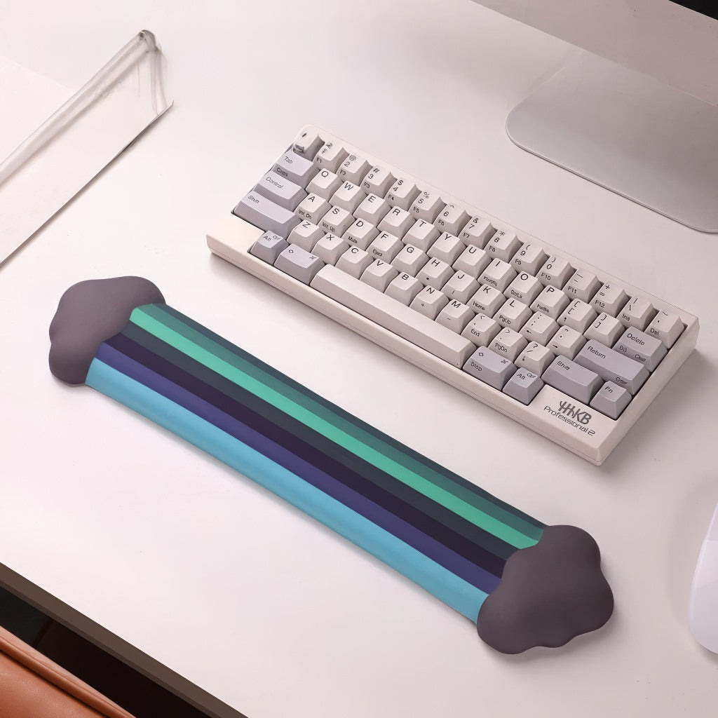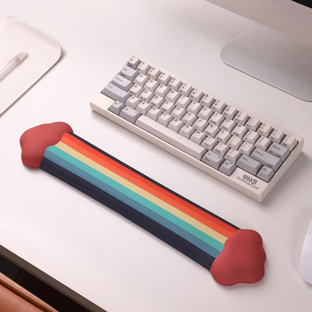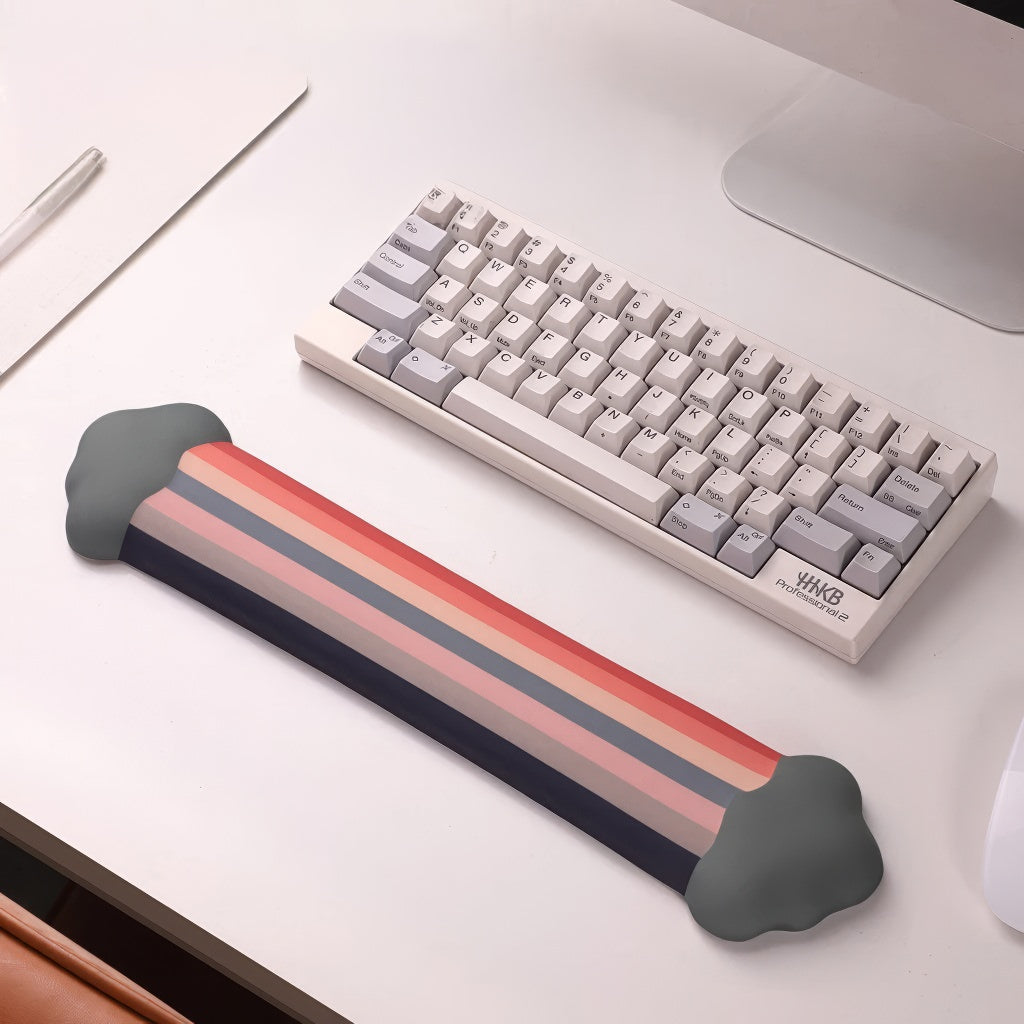 Diese Regenbogen-Handgelenkauflage verleiht jedem Arbeitsplatz eine farbenfrohe und verspielte Note. Das Design zeigt einen weichen, geschwungenen Regenbogen, der an beiden Enden von flauschigen weißen Memory Foam-Wolken gehalten wird. Die ergonomische Handgelenkauflage ist mit ihrer weichen, gepolsterten Textur auf Komfort ausgelegt. Das passende Mauspad spiegelt den gleichen Regenbogenbogen wider und sorgt so für eine einheitliche, auffällige Ästhetik. Dieses Set passt gut zu Indie- oder Kawaii-Schreibtisch-Setups und verleiht Ihrem Arbeitsplatz Charme und Persönlichkeit.