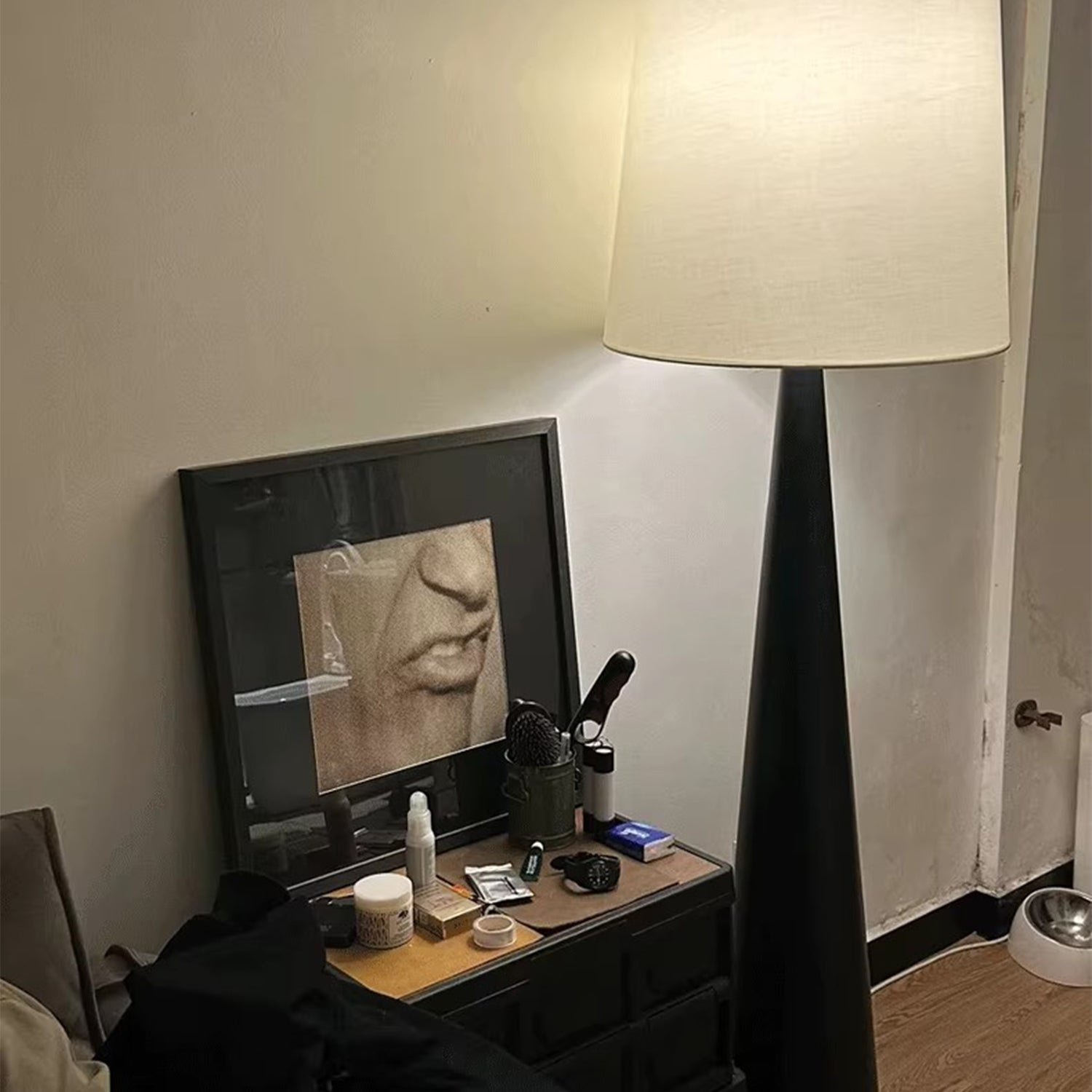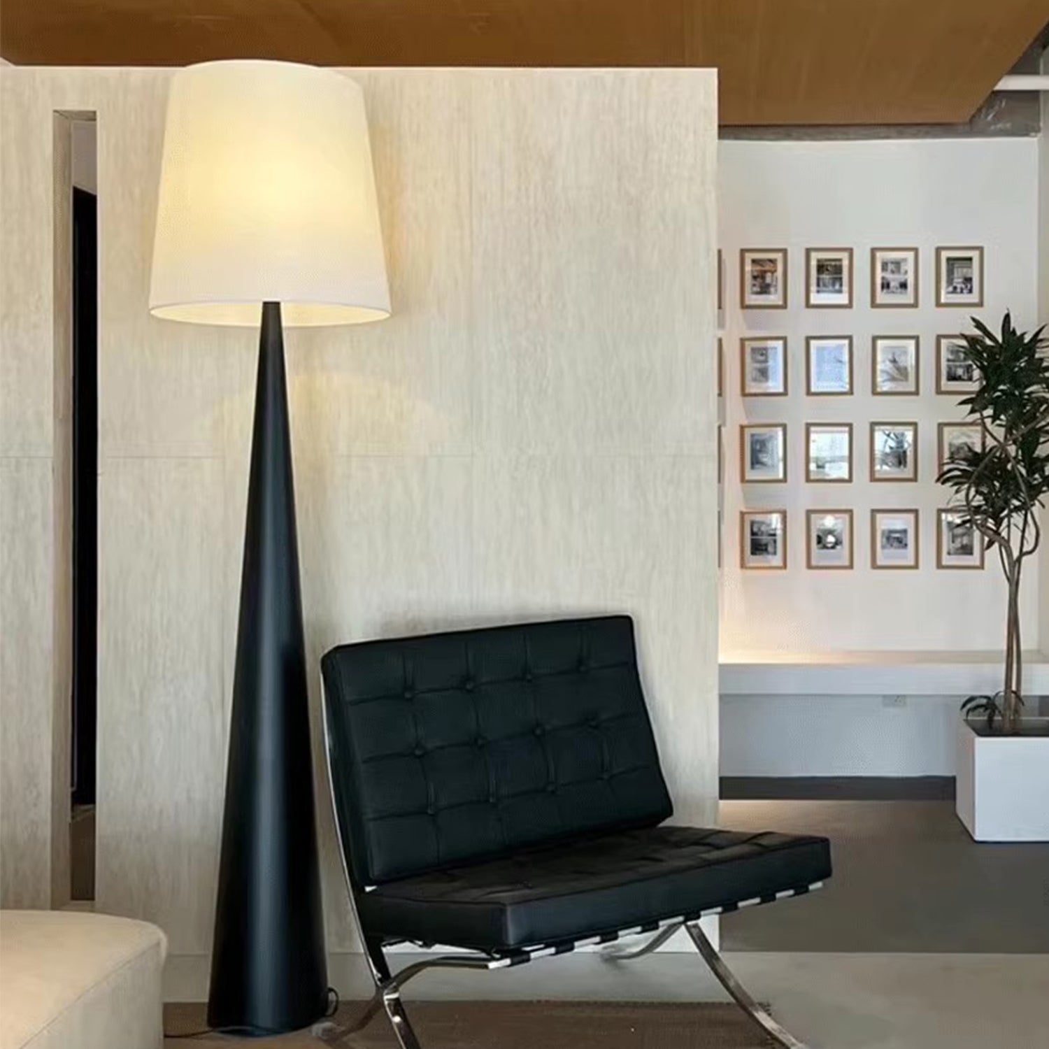 Erhellen Sie Ihre modernen oder Vintage-Räume mit unserer Stehlampe. Mit ihrem robusten Kiefernholzfuß und der mattschwarzen Oberfläche vereint diese Stehlampe Langlebigkeit und Eleganz. Der hohe, cremeweiße Lampenschirm sorgt für eine warme und einladende Atmosphäre – ob im Wohnzimmer, Schlafzimmer oder Homeoffice.