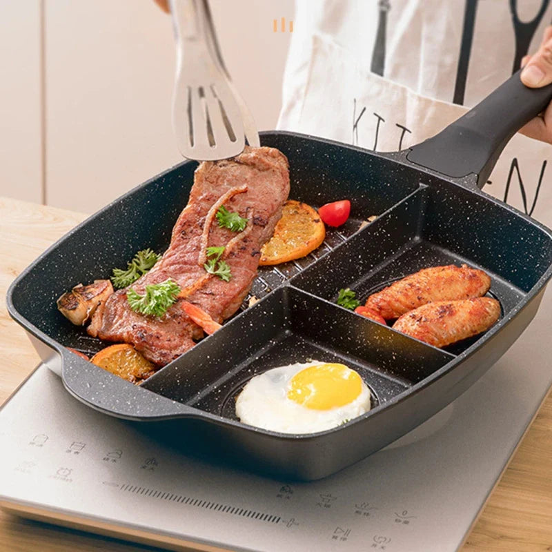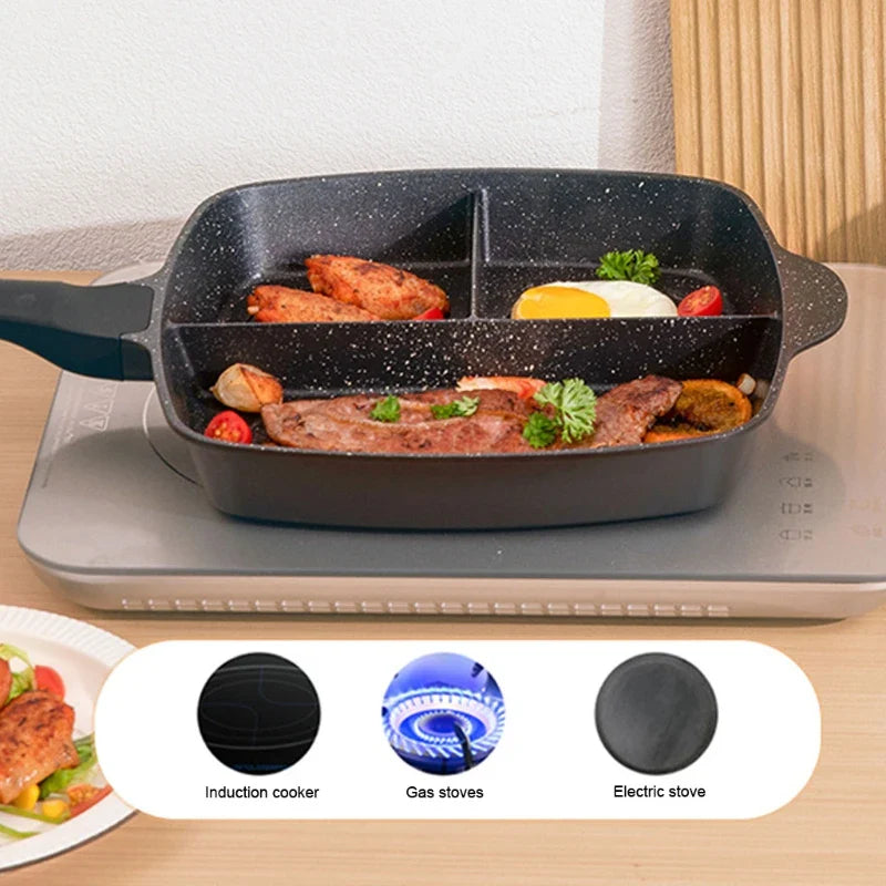 Wir präsentieren das ultimative Kochwerkzeug – die 3-in-1-Antihaft-Bratpfanne. Diese griffige Pfanne aus robustem Aluminium mit Antihaftbeschichtung eignet sich perfekt zum gleichzeitigen Braten mehrerer Speisen, ohne dass etwas anbrennt oder stockt. So erzielen Sie garantiert die gewünschten sauberen Ergebnisse.