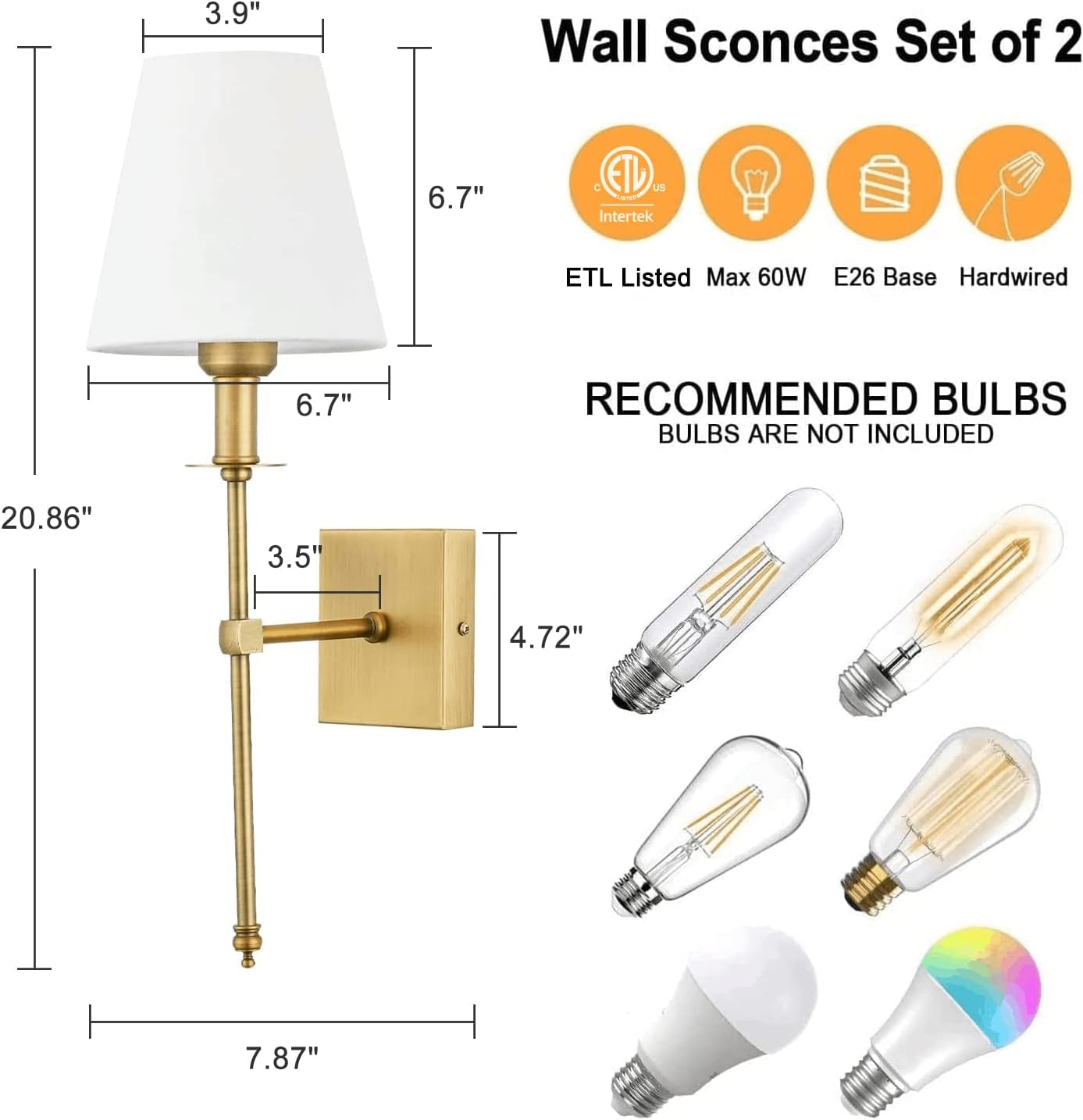 Bsmathom Wandleuchten-Sets mit 2 Stück, Wandleuchten aus gebürstetem Messing mit Stoffschirm, festverdrahtete Badezimmer-Waschtischleuchte mit Säulenständer für Flur, Eingangsbereich, Durchgang, Küche, Gold