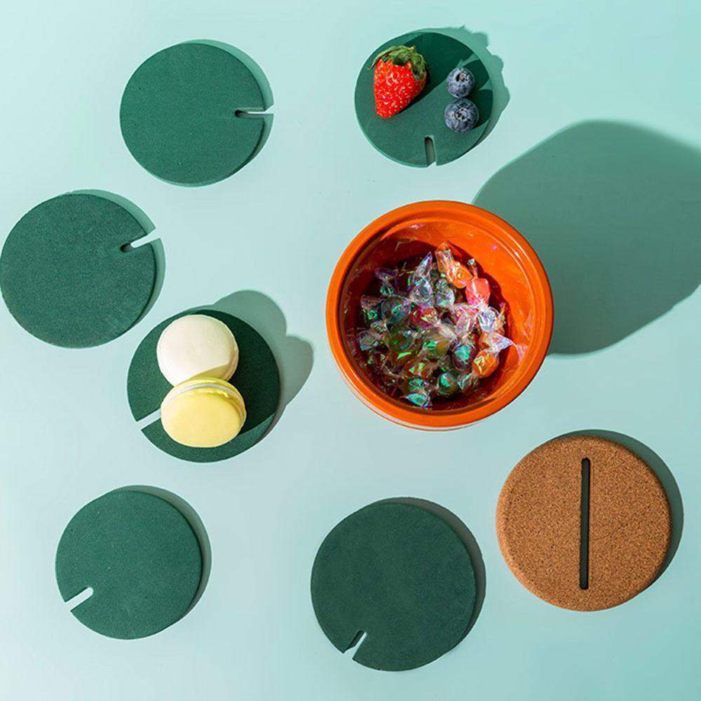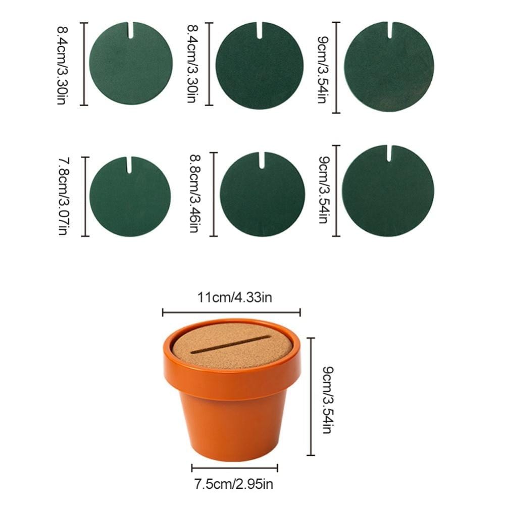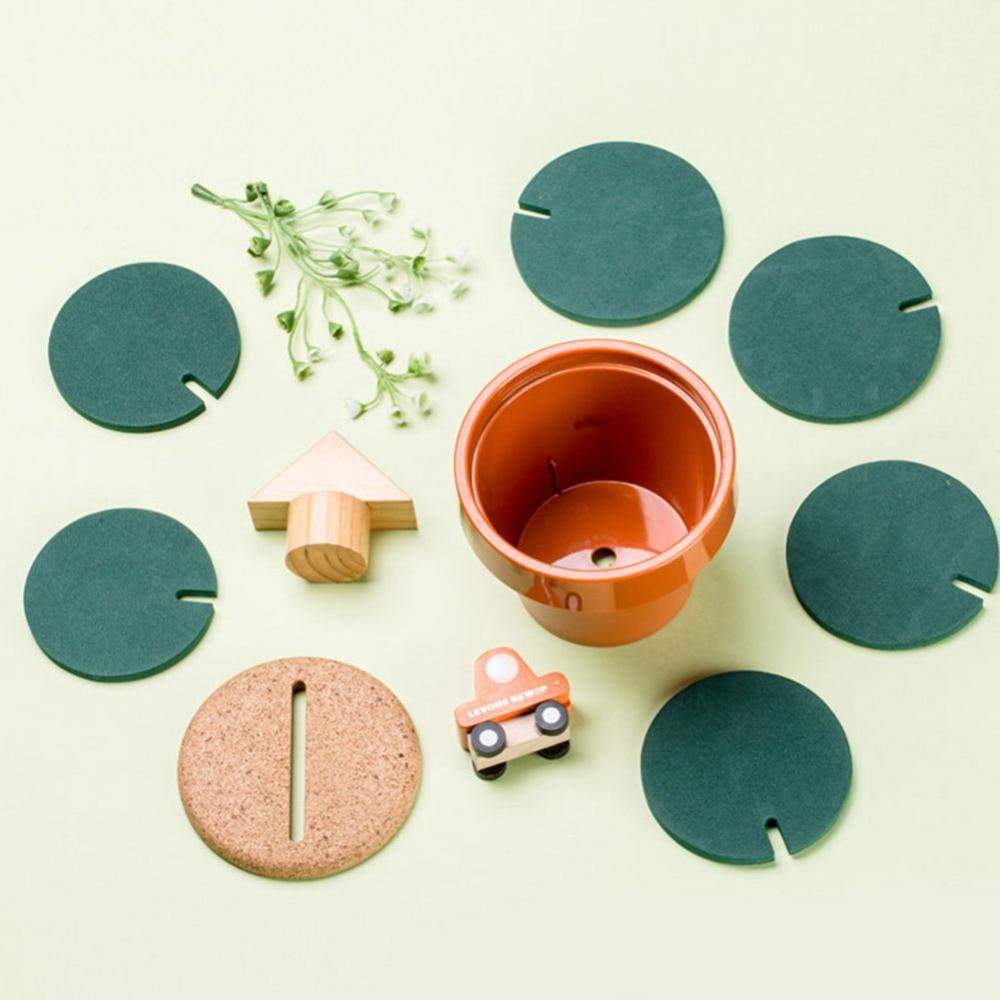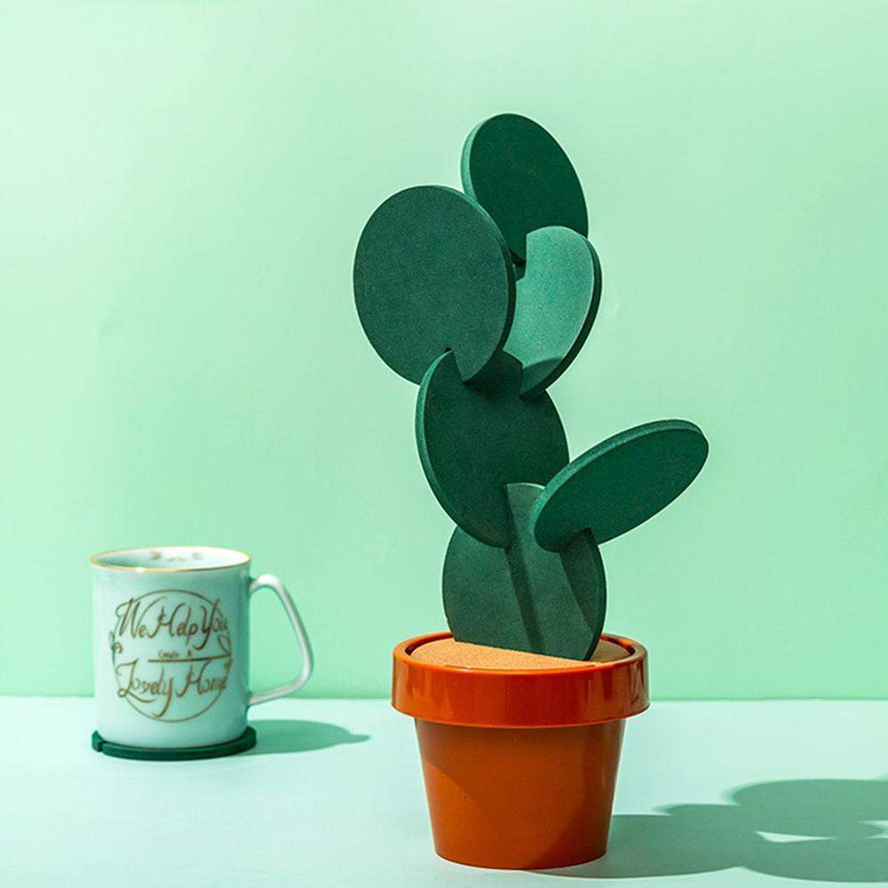 Untersetzer schützen Ihre Oberflächen und ein Kaktus verschönert Ihr Zuhause. Kombinieren Sie beides. Diese Pflanzenskulptur besteht aus ineinandergesteckten Untersetzern. Bauen und arrangieren Sie Ihre Kakteen in endlosen kreativen Kompositionen. Schluss mit dem uralten Ärger, Ihre Untersetzer in einer Schublade aufzubewahren, wenn Sie keinen Tee trinken. Kaktus-Untersetzer sind gleichermaßen nützlich und dekorativ. Jedes Set enthält sechs mit Kork überzogene Holzmatten, die ordentlich in einem Terrakotta-Blumentopf aufbewahrt werden, und einen Deckel mit Schlitzen. Ein kreatives Geschenk für einen durstigen Pflanzenliebhaber.