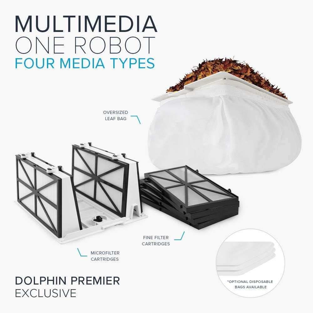 Ein Roboter. Vier Medientypen.Welchen Medientyp bevorzugen Sie? Egal, welchen Sie wählen, Sie müssen zum ersten Mal keine Kompromisse eingehen. Wählen Sie das richtige Medium für die jeweilige Aufgabe. Sie möchten feine Ablagerungen und Algen entfernen, die durch andere Poolreiniger gelangen? Dann entscheiden Sie sich für einen Mikrofilter. Sie müssen einen ganzen Scheffel Blätter aufsammeln? Dann entscheiden Sie sich für einen übergroßen Schmutzbeutel. Wie viele Poolroboter bieten Multimedia? Genau einer... nur Dolphin Premier.