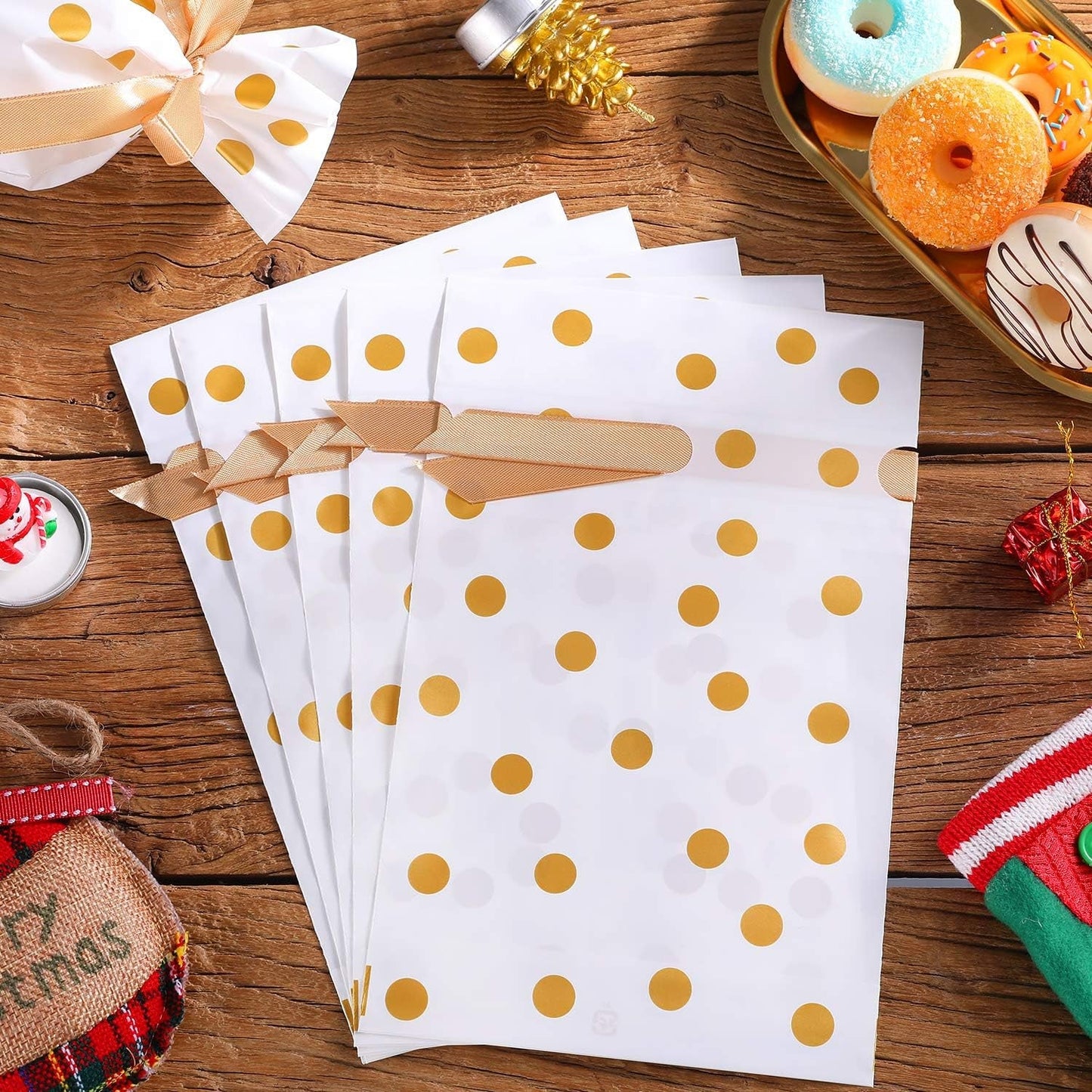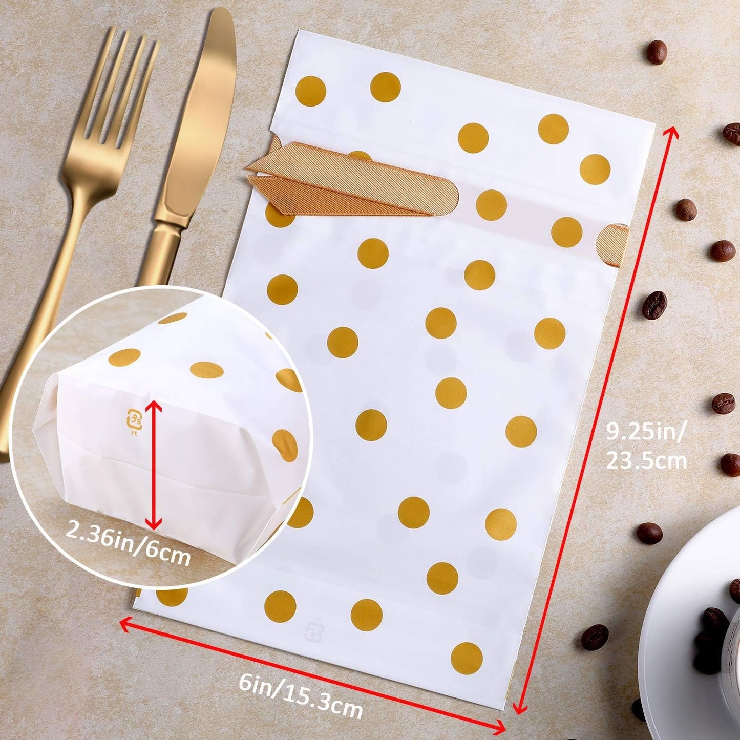 • Vielseitig einsetzbar: ideal zum Verpacken von Brot, Keksen, Süßigkeiten, Backwaren, Snacks, Popcorn, Schokoriegeln, Leckereien usw.; die goldenen Tüten mit Polka-Muster eignen sich nicht nur hervorragend zum Verpacken von selbstgemachten Keksen, Süßigkeiten, Gebäck und Donuts, sondern auch zum Verpacken von Geschenken zur Dekoration Ihrer Party.