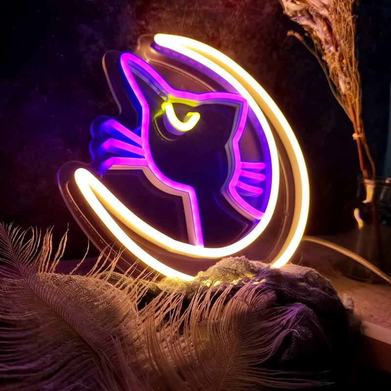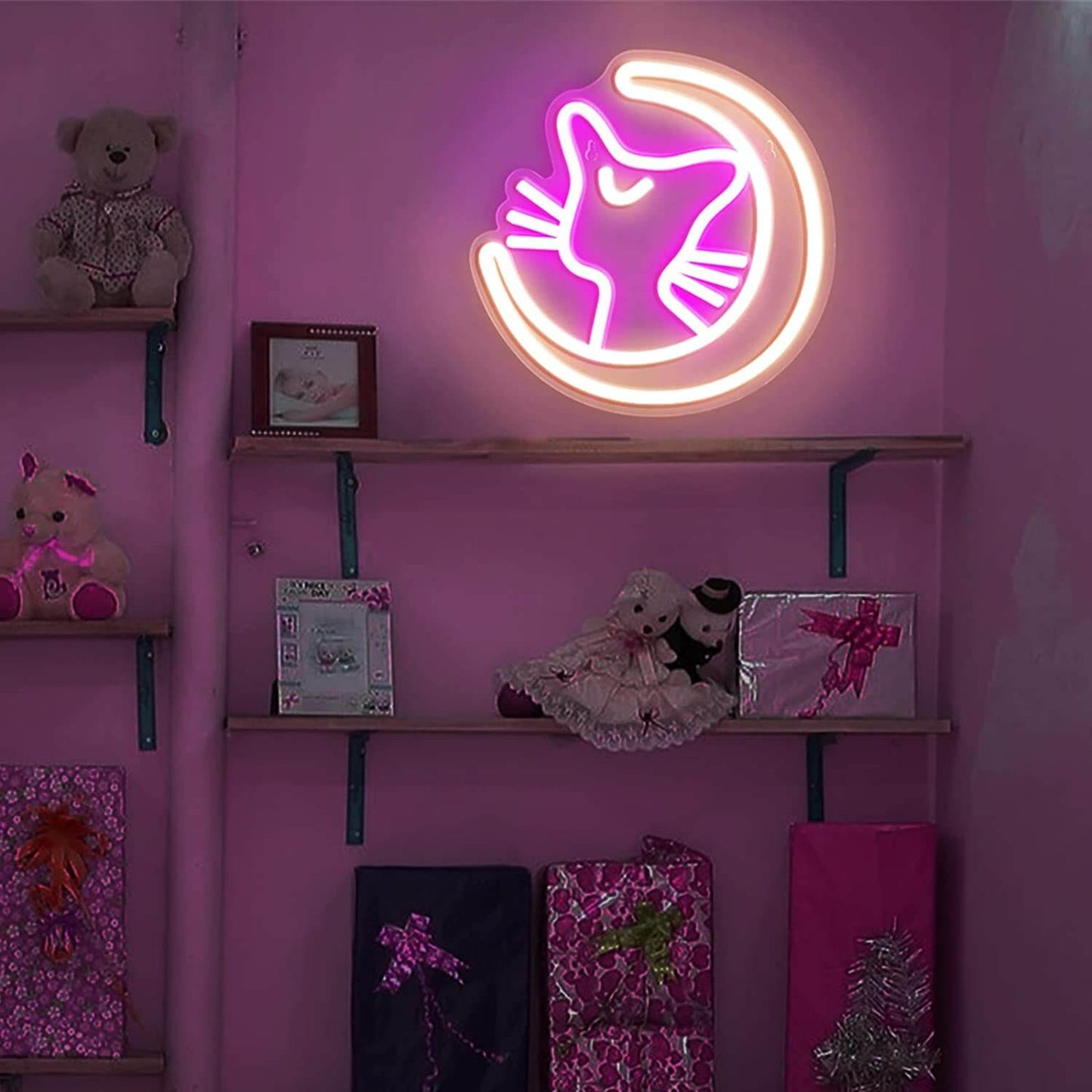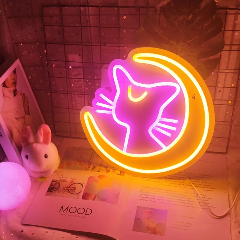 Diese große Kawaii-Mondkatzen-Wandleuchtreklame auf Acrylplattenbasis verleiht Ihrem Zimmer eine schillernde Note. Machen Sie unglaubliche Streams, Fotos und genießen Sie sanftes Umgebungslicht. Passt perfekt als Wanddekoration für E-Girl- oder Kawaii-Ästhetikliebhaber.