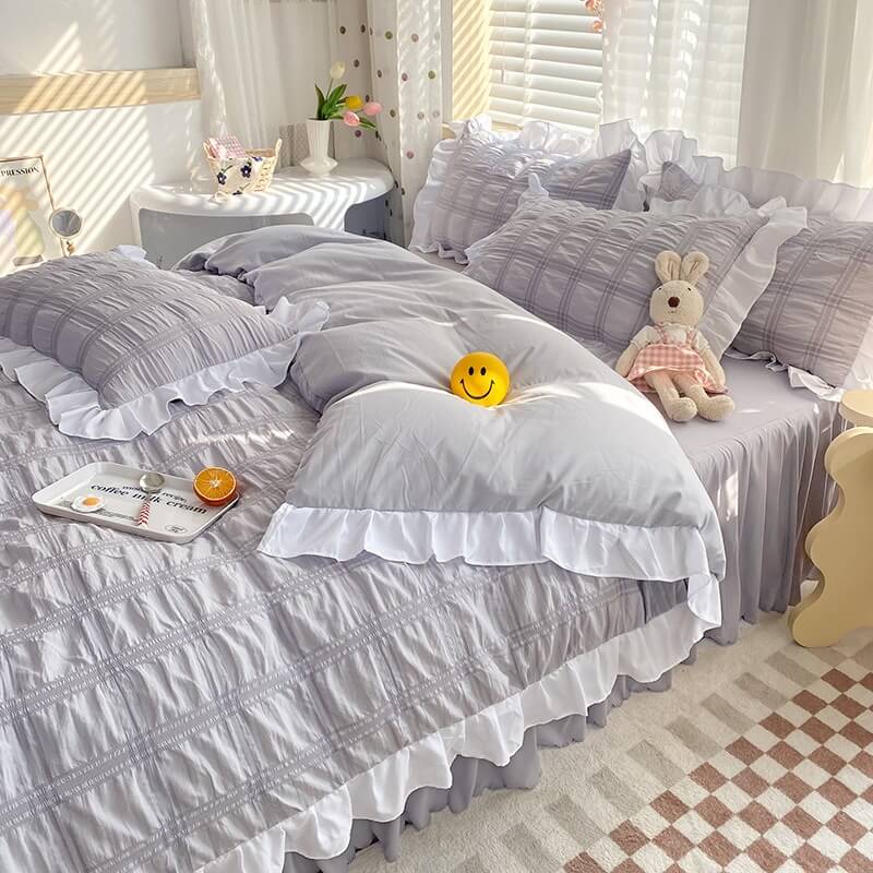 Weiches und bequemes Rippbettwäscheset mit Rüschen am Rand der Kissenbezüge und des Bettbezugs. Erhältlich in zwei Optionen – mit Bettlaken und Rock mit Gummibändern für eine einfache Nutzung. Dieses ästhetische Bettwäscheset passt perfekt in Kawaii, Soft Girl und viele andere ästhetische Räume.