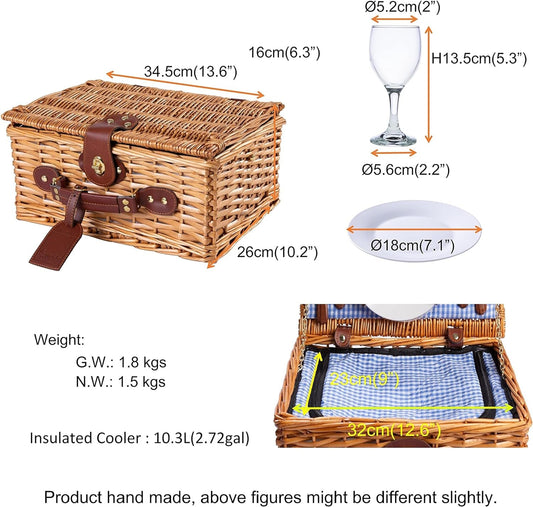 Wicker Picnic Basket for 2 | Set with Insulated Cooler, Plates, Portable Utensils | Blue