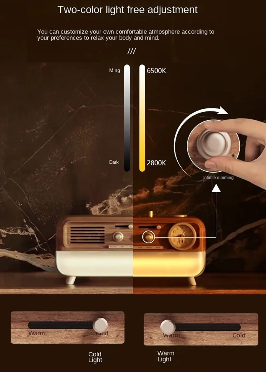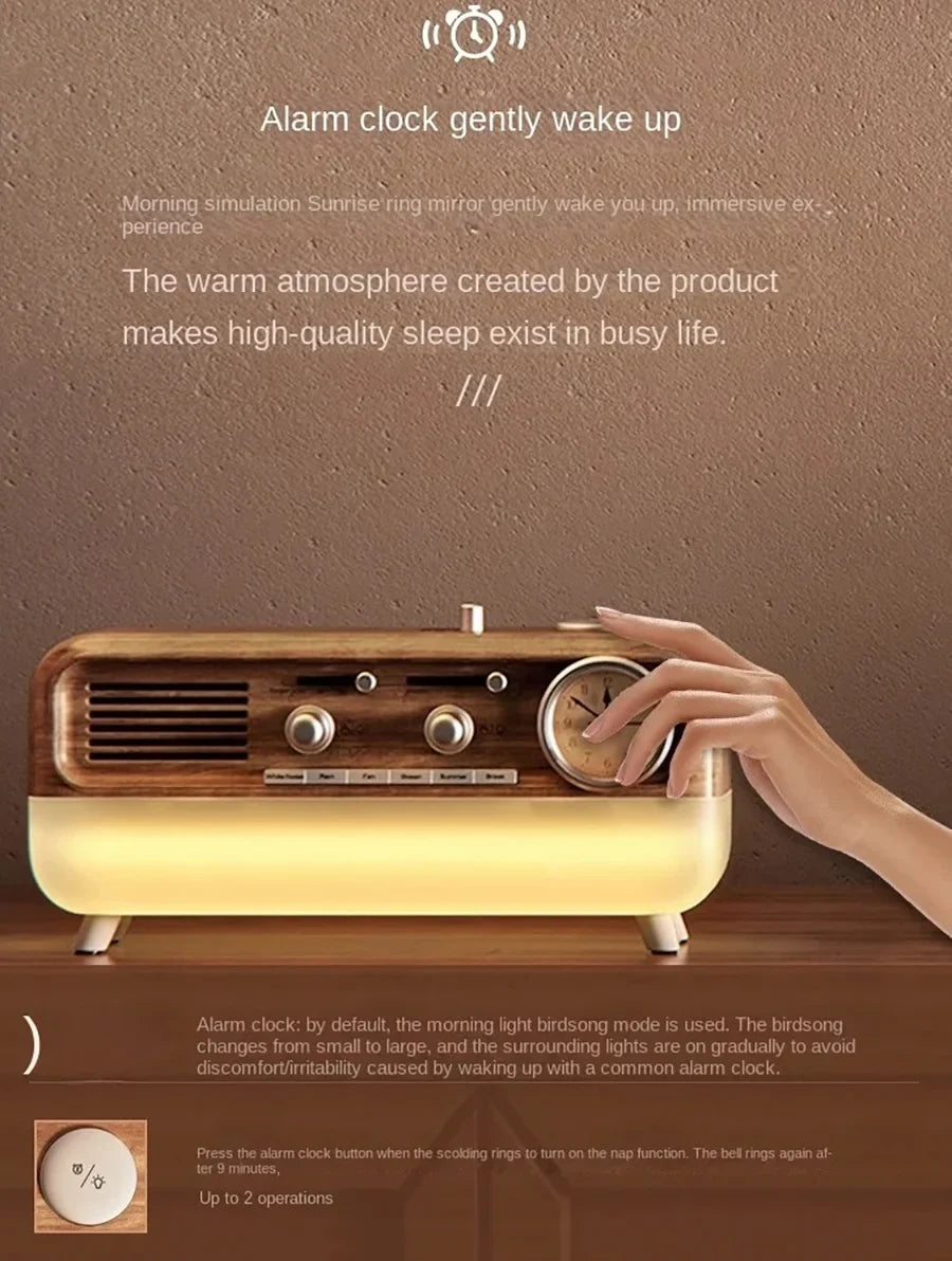 Its retro wood grain finish adds a touch of timeless charm to your nightstand, while its multifunctionality helps you relax, recharge, and start your day refreshed.