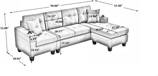 Gray Sectional Sofa with Reversible Left/Right Chaise Lounge and 2 Cup Holders, 4-Seat L-Shaped Couch for Home Apartment Living Room Compact Space Furniture