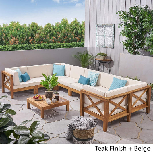 Great Deal Furniture Keith Outdoor Acacia Wood 8 Seater U-Shaped Sectional Sofa Set with Coffee Table, Teak and Beige