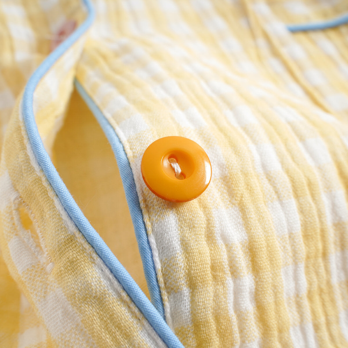 Light and breezy, this short-sleeve pastel gingham pajama set is made for sunny mornings and warm nights. The top features a classic collar, pastel buttons, and cute contrasting piping around the sleeves and pocket. The matching shorts are soft and stretchy at the waist, making them easy to slip on and off. Made from crinkled cotton, this set feels cool and relaxed from the moment you put it on—ideal for lounging, sleeping, or just relaxing at home in style.