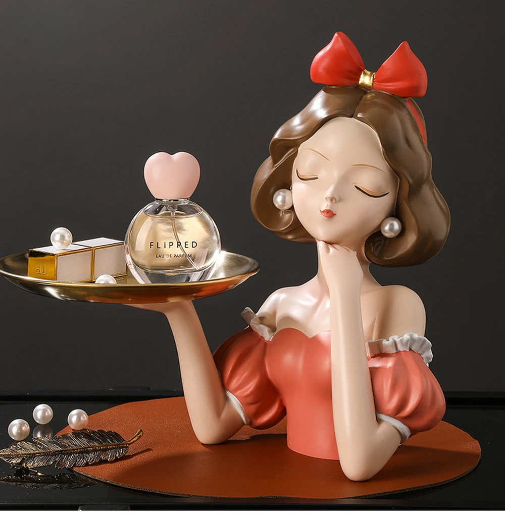 Enhance your home with the enchantment of our Princess Figurines Home Decor, a splendid addition that merges utility with a touch of royal charm. This unique piece features a storage metal tray complemented by a non-slip leather pad, ensuring both elegance and functionality.