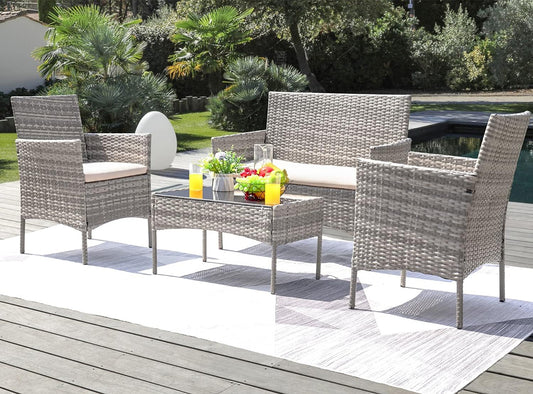 Greesum Terrassenmöbel, 4-teiliges Gesprächsset, Gartenmöbel aus geflochtenem Rattan, für den Außenbereich, Garten, Hinterhof, Balkon, Veranda, Pool-Sofa mit weichem Kissen und Glastisch, Grau und Beige