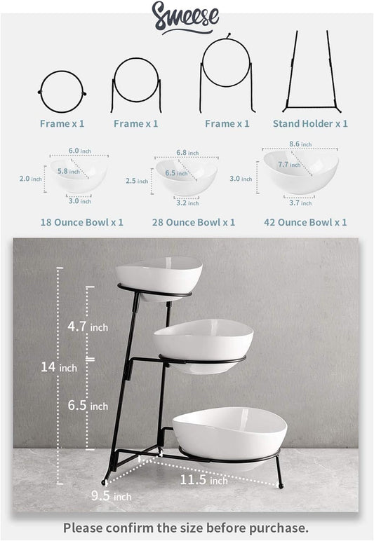 Sweese 736.101 Conjunto de tigela oval de 3 camadas com rack de metal mais resistente, suporte para servir em camadas, conjunto de servir chips e molhos - Tigelas de servir para festas
