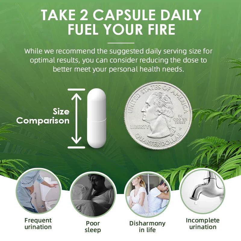 Certifié par la CFDA , notre complément alimentaire à base de palmier nain est soigneusement formulé pour soutenir la santé masculine. Il associe des ingrédients naturels qui favorisent la fonction prostatique, réduisent la chute des cheveux et favorisent une croissance saine de l'intérieur. Chaque flacon contient 120 gélules , d'une durée de conservation de 2 ans , conçues pour une utilisation quotidienne pratique. Posologie recommandée : 2 gélules par jour avec de l'eau ou selon les recommandations d'un professionnel de santé.