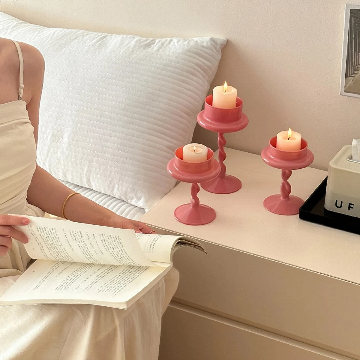A sleek, glossy pink glass candle holder with a twisted stem and elevated round top, perfect for taper or pillar candles. Its form catches the light beautifully, adding a pop of color to any room. Available in two sizes, making them ideal for mixing and matching as a centerpiece or shelf accent.