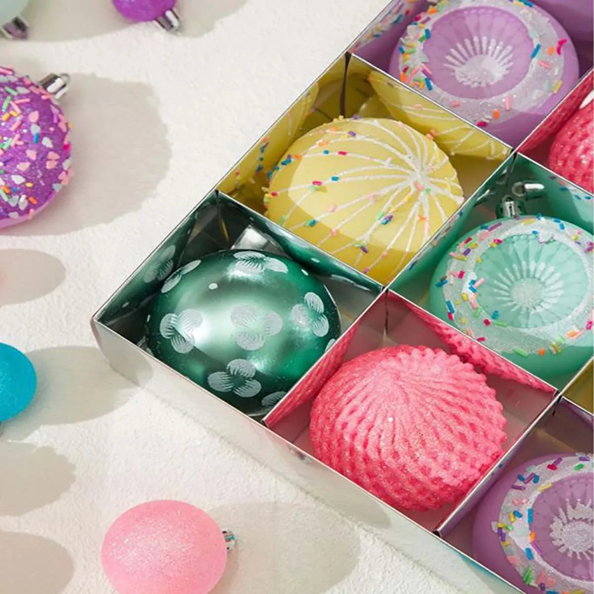 La collection de décorations de Noël Pastel Dream apporte une touche fantaisiste à votre décoration de Noël avec des teintes douces et des motifs texturés uniques. Chaque ensemble comprend une variété de boules de Noël aux couleurs pastel, avec des motifs complexes, des textures en forme de coquillage et des accents délicats ressemblant à des bonbons. Les nuances douces de rose, de vert menthe, de lavande et de jaune crémeux offrent une touche ludique mais élégante aux décorations de Noël traditionnelles. Parfaites pour ajouter une ambiance douce et rêveuse à votre sapin de Noël, ces décorations sont idéales pour créer une atmosphère légère et festive avec une esthétique pastel moderne.