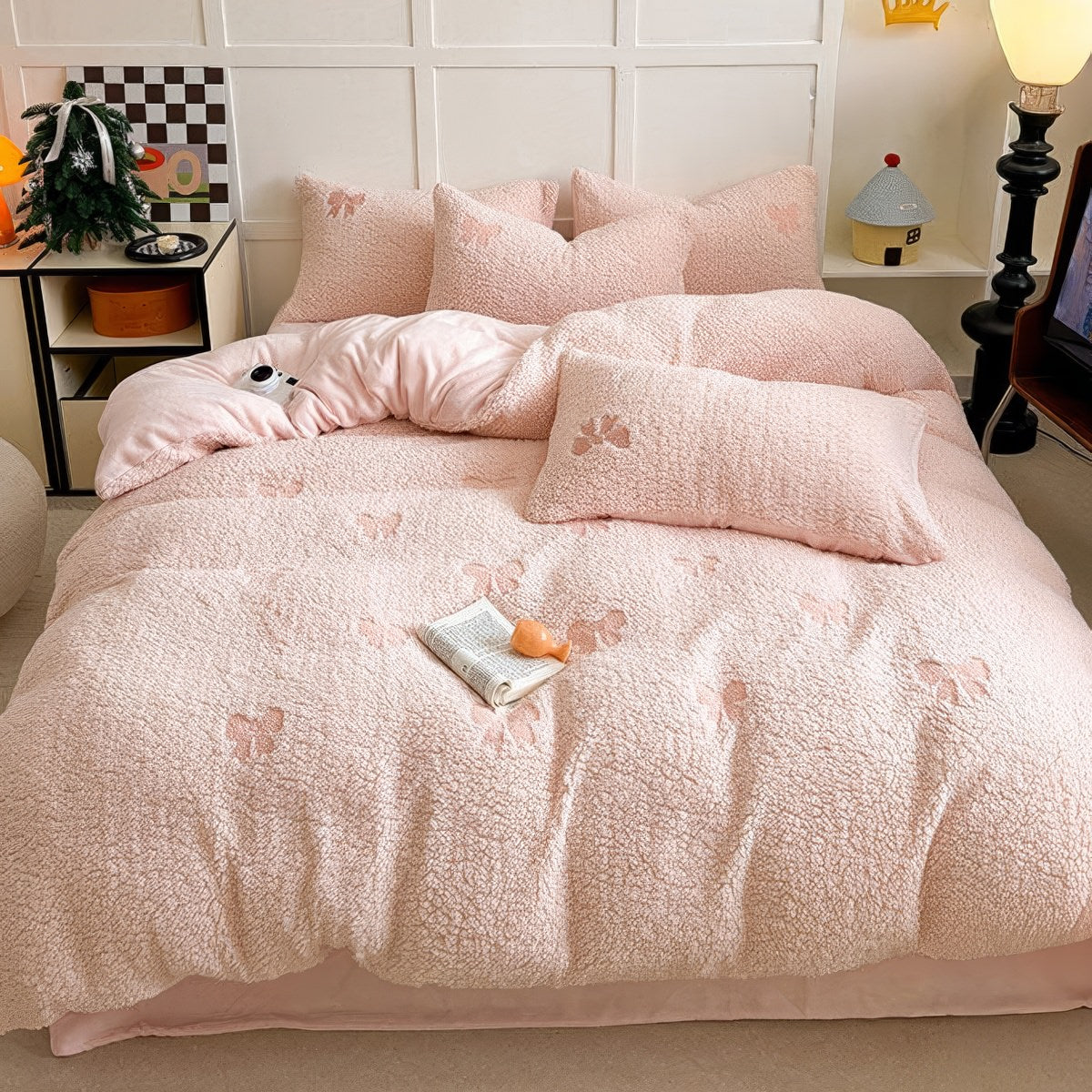 Parure de lit en sherpa moelleux ornée de broderies de nœuds. Douce et chaude, elle est disponible en crème, bleu pastel et rose poudré.