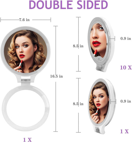 Deweisn Miroir grossissant 10X/1X, miroir de table double face avec poignée pliante réglable, miroir cosmétique avec lumières pour le maquillage de voyage, 3 couleurs de lumière