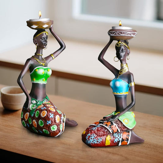 Lot de 2 bougeoirs en forme de statue de femme africaine, 21,6 cm, statue de femme tribale traditionnelle, sculpture décorative, bougeoir pour table, salle à manger, cadeau vintage afro-américain
