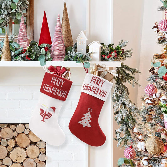 Merry Chrismukkah Bas de Noël Hanukkah, 25,4 x 38,1 cm, chaussettes de rangement en toile de jute, décorations de fête de Noël Chanukah, éléments classiques, y compris menorah, chapeau de Père Noël, arbre de Noël
