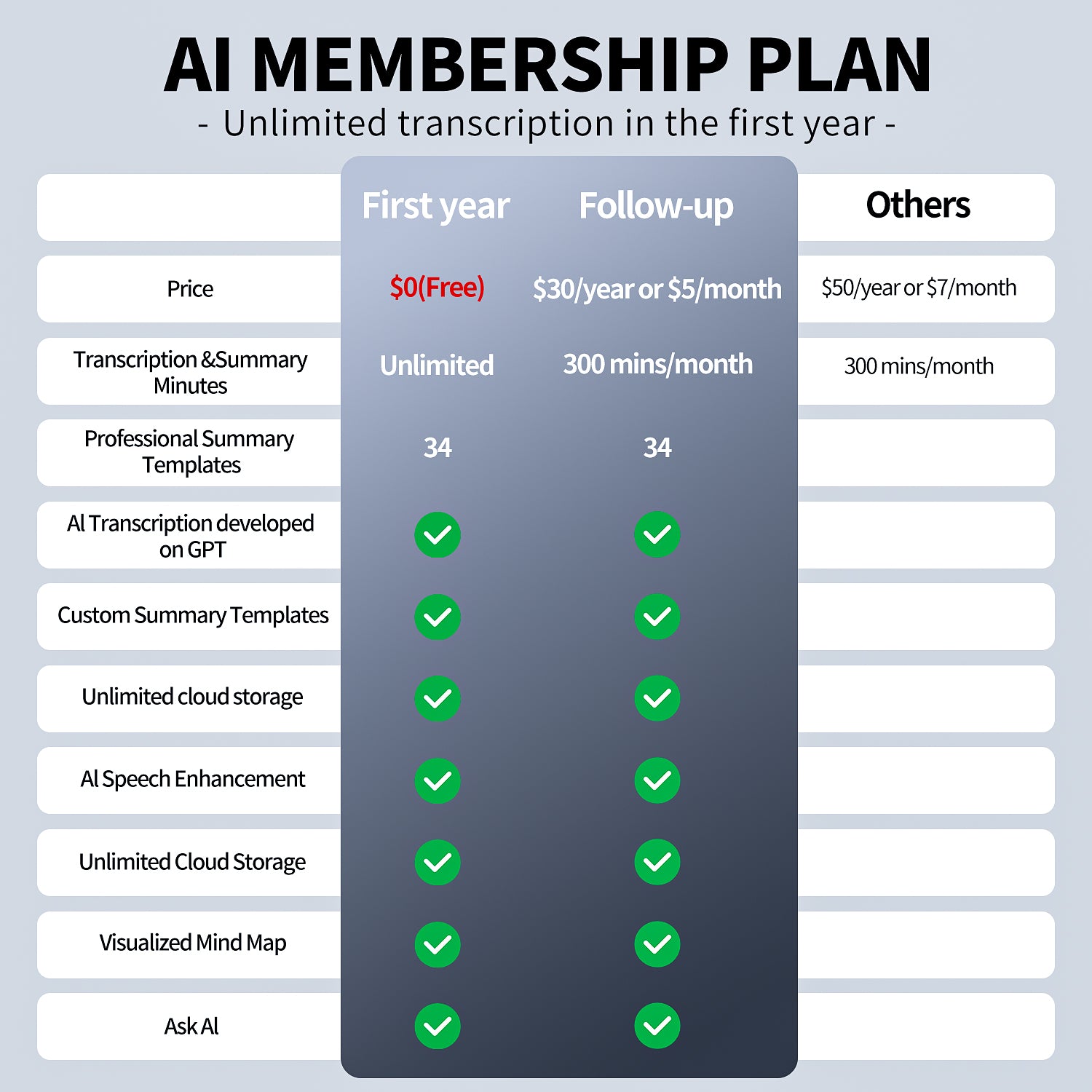 All-in-One Meeting Tool – Auto-generate action items, call recordings, and mind maps. Year 2: Keep 300 free mins/month or upgrade to unlimited ($30/year).
