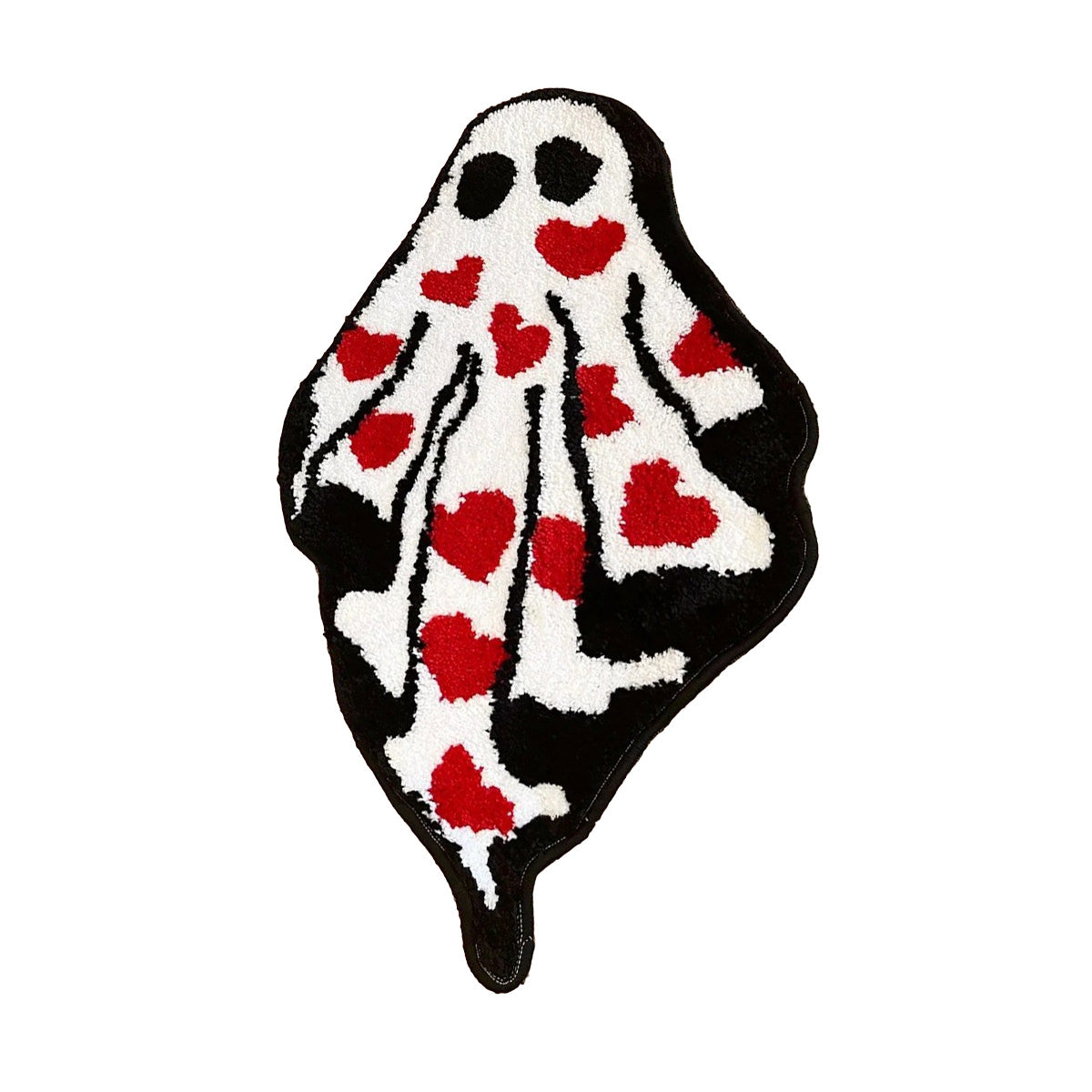 Dieser getuftete Teppich besticht durch sein geisterförmiges Design mit einem starken Kontrast aus Schwarz, Weiß und Rot. Der Körper des Geistes ist überwiegend weiß und mit verstreuten roten Herzen verziert, während die schwarze Kontur die Form unterstreicht. Die getuftete Textur sorgt für eine gemütliche Atmosphäre und macht ihn zu einem Statement für Gothic-, Indie- oder alternative Ästhetik. Seine unregelmäßige Form und das verspielte Design machen ihn ideal für Schlafzimmer, Wohnräume oder thematische Dekorationen.
