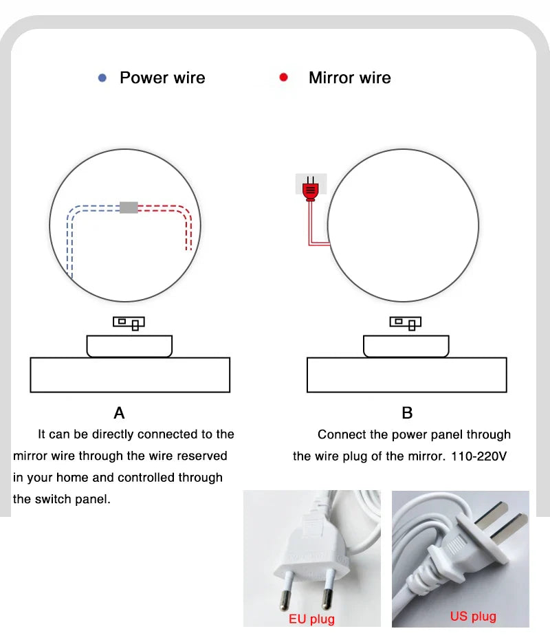 Crafted with high-quality silver lenses, the 8-inch round mirror delivers crisp, distortion-free reflections. The IPX4 waterproof rating ensures durability and safe operation in moisture-prone areas, making it a reliable choice for bathrooms and hotel settings.