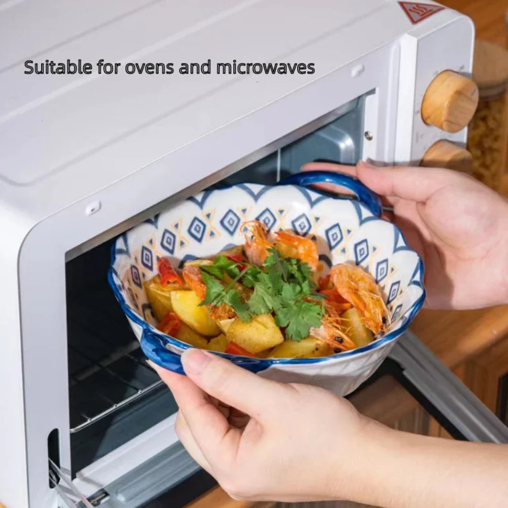 Turn every meal into a small celebration with these scallop-edged ceramic handle bowls, where artistry meets everyday living. Each bowl is hand-finished with vibrant under-glaze patterns that bring a touch of personality to your table, whether you’re serving a steaming noodle soup, a crisp summer salad, or a comforting oven-baked dish.