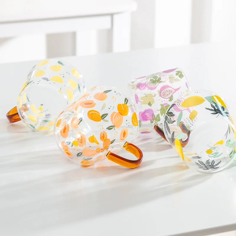 Brighten up your kitchen with the Fruit Orchard Harmony glass mug collection. Featuring four charming designs—lemon, pear, peach, and fig—these mugs capture the beauty and vibrance of a sunny orchard. Each mug is adorned with playful fruit illustrations and delicate details, bringing a refreshing pop of color to your morning coffee, afternoon tea, or favorite cold drinks. Made from durable glass with comfortable handles, this set is as functional as it is stylish.
