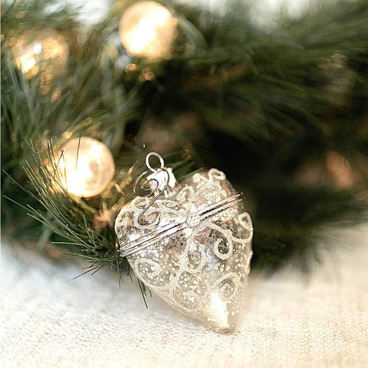 1 ornamento natalizio in vetro con mercurio e cuore argentato - Decorazione natalizia di qualità cimelio dall'aspetto vintage. Si apre per aggiungere piccoli regali: include 6 ganci a spirale