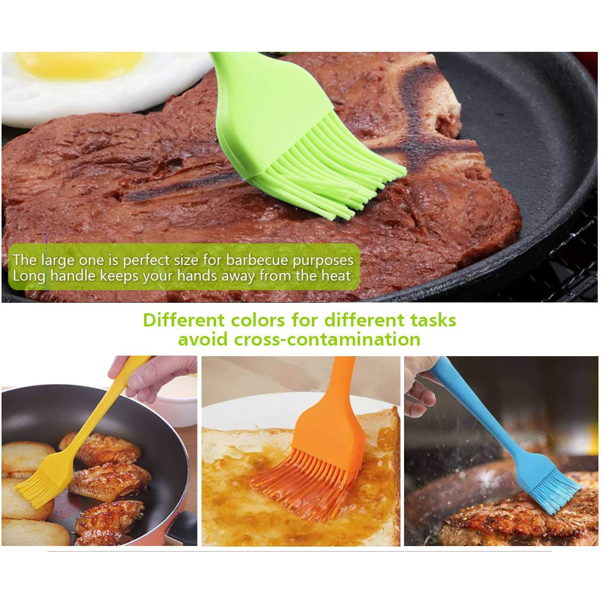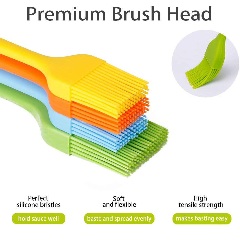 - PERFECT FOR BASTING AND PASTING: With 85 bristles (5raw x 17 bristles/raw) on the big brush, 52 bristles (4raw x 13 bristles/raw) on the 3 smaller ones, the silicon basting brushes are able to hold good amount of liquids. High tensile strength makes the pasting brushes baste and spread liquids evenly. The soft and flexible silicone bristles are suitable for delicately pasting rolls/cakes without dragging the dough or scratching the pan. Works great on meats, pastries, cakes, desserts and more!