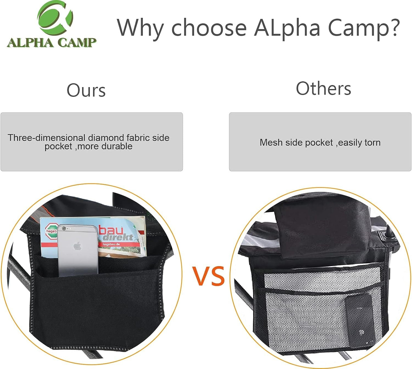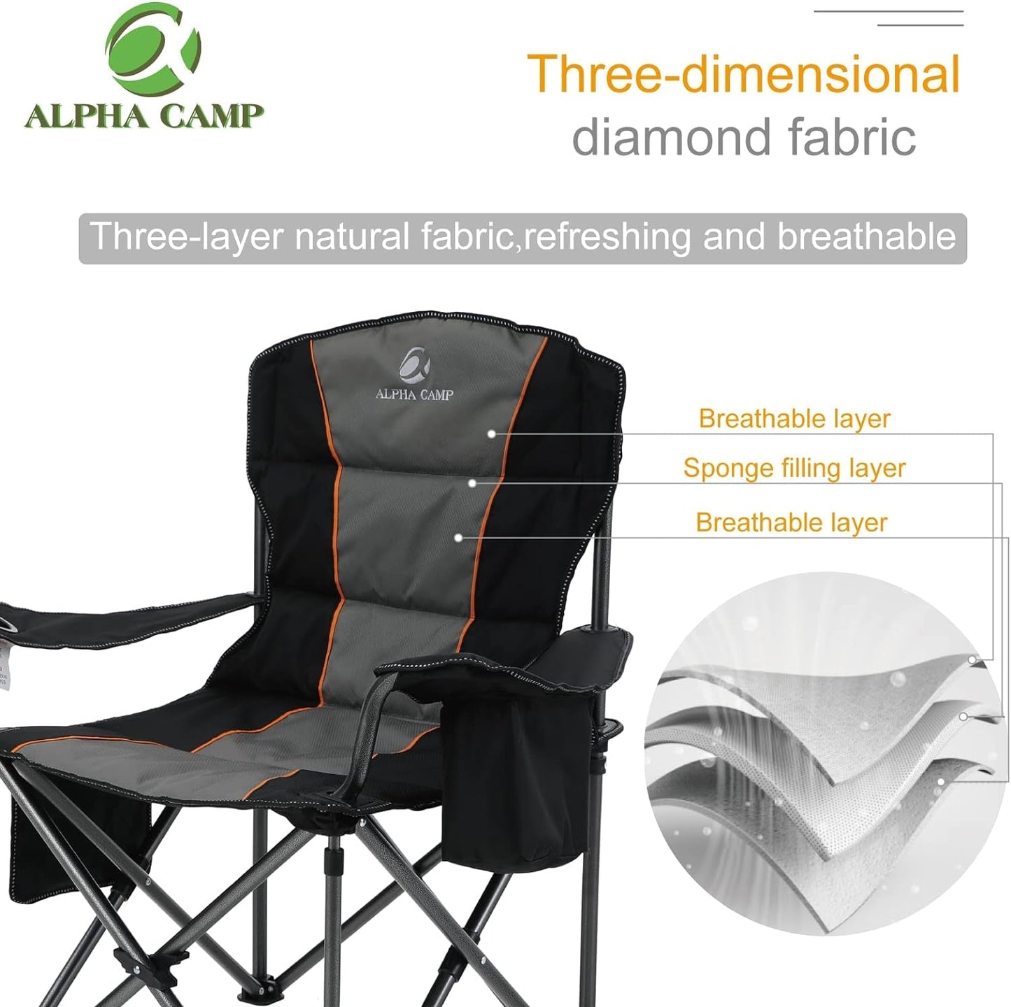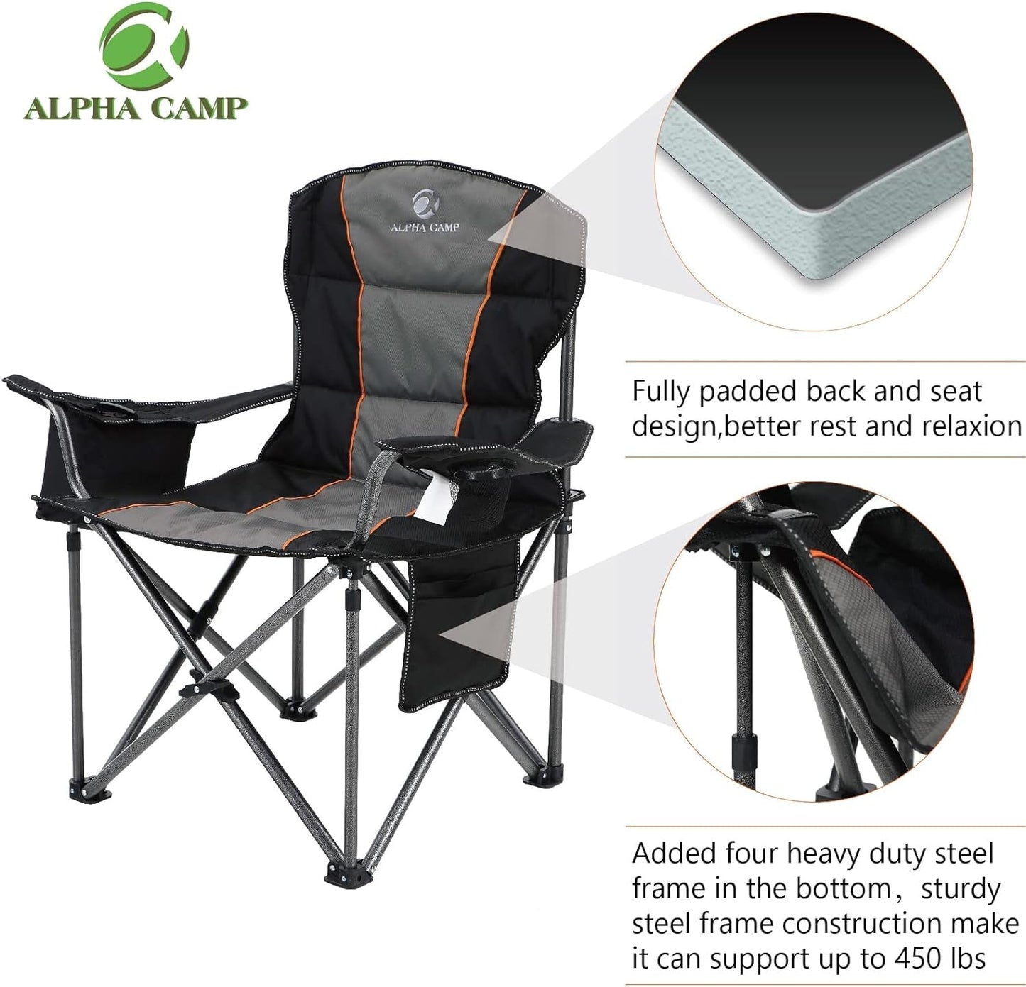 ALPHA CAMP Oversized Camping Folding Chair, Heavy Duty Support 450 LBS Steel Frame Collapsible Padded Arm Chair with Cup Holder Quad Lumbar Back, Portable for Outdoor,Black