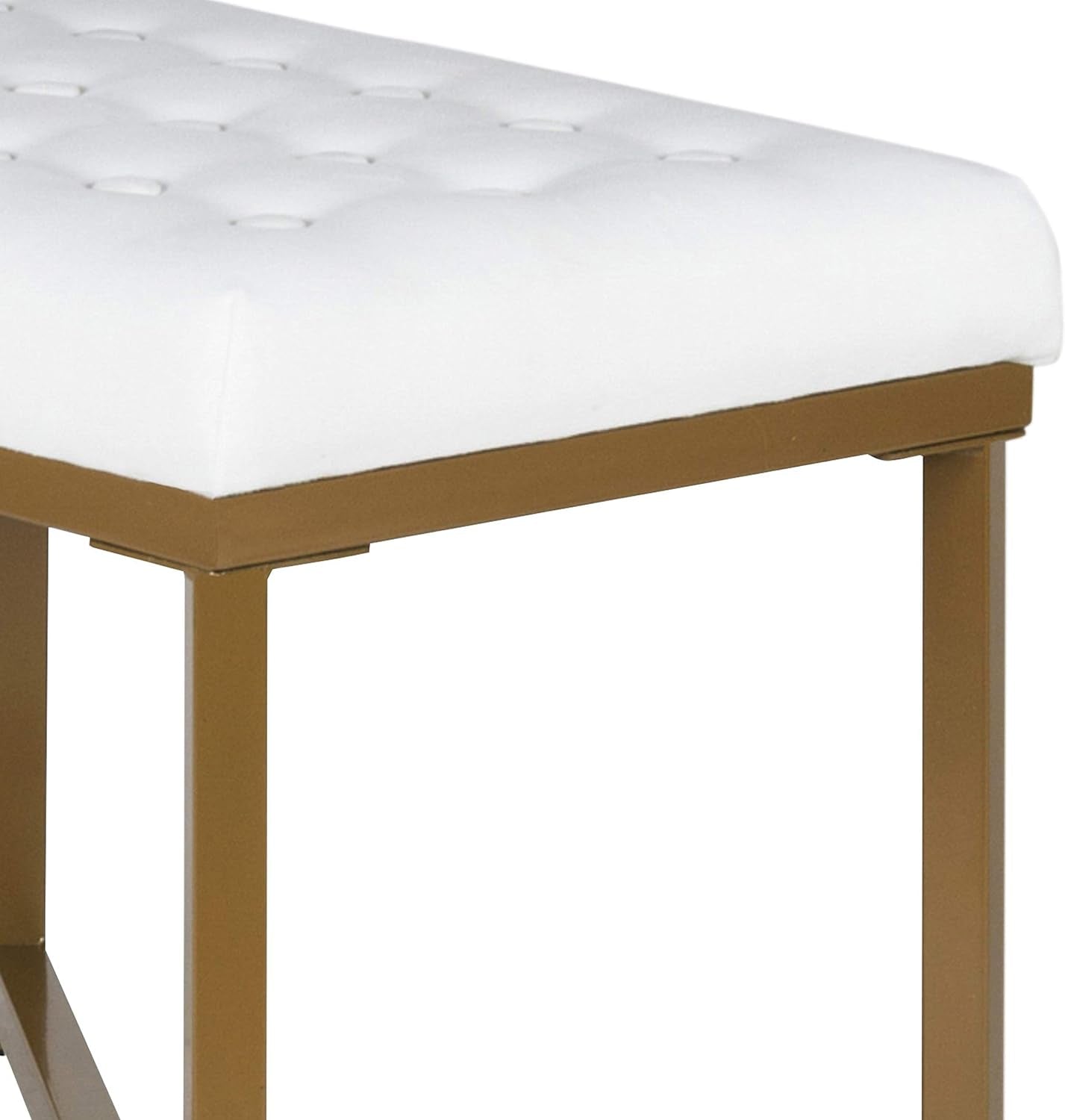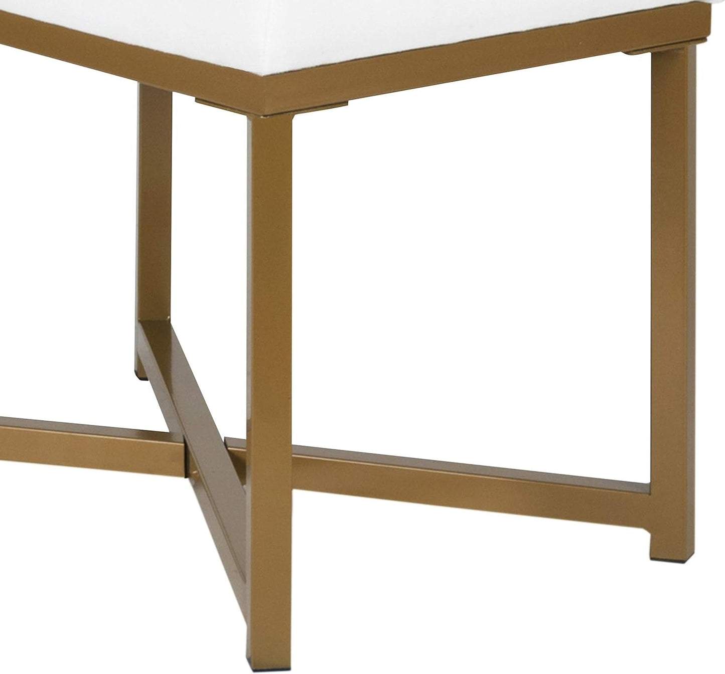 Upgrade your living space by the addition of this simple yet stylish bench that will add a classic touch to your home. Supported by designer metal frame in gold finish, this bench features white velvet upholstered cushioned seat with button tufted detailing and sleek metal legs with x shape base support. The sturdy legs incorporates floor protectors that provide scratch free mobility. You can combine two benches for a smart look and functional seating solution at the end of your bed, in your entryway or living room.
