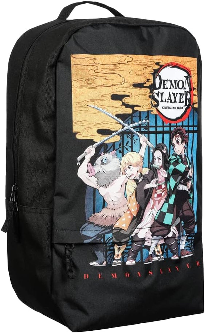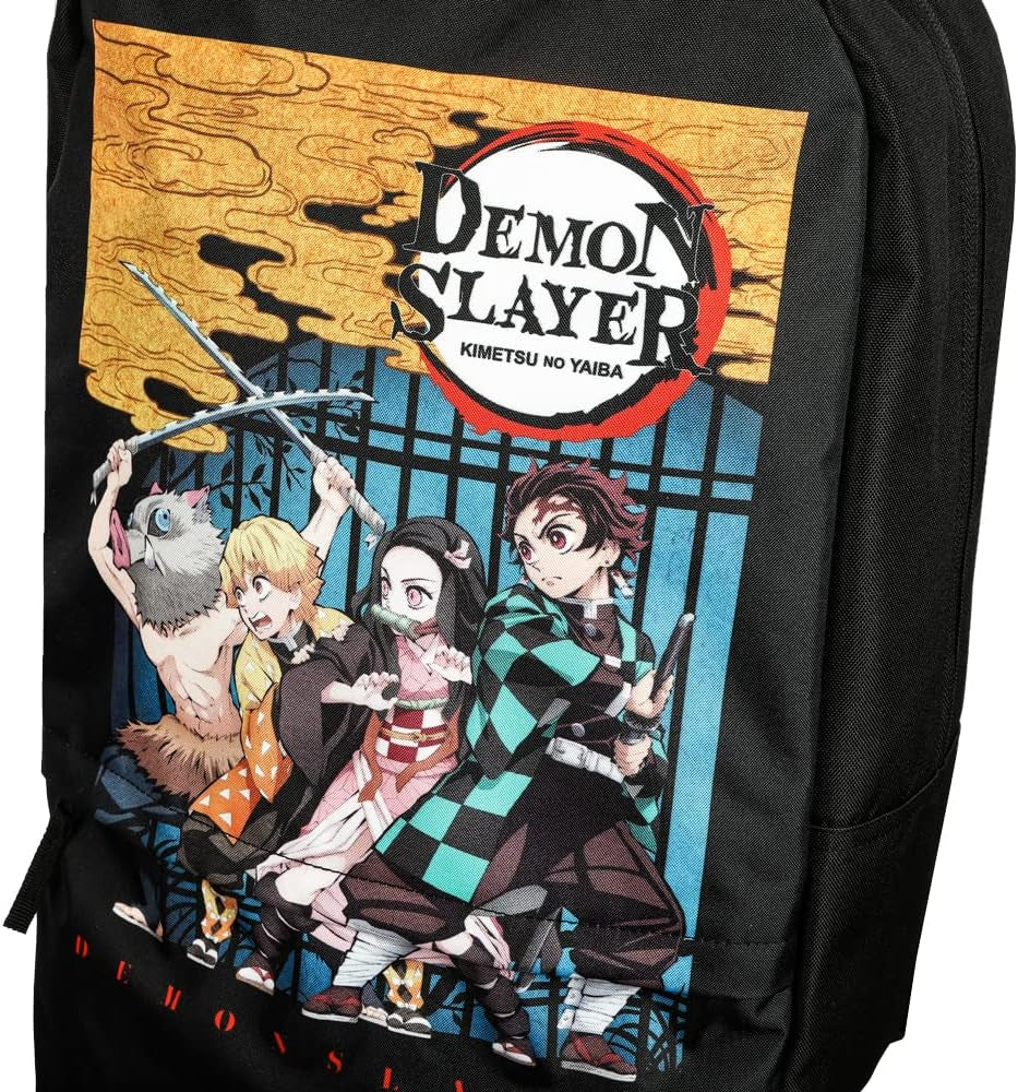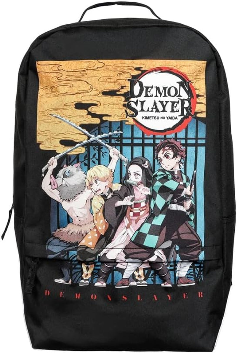 Celebrate your favorite manga series with this Demon Slayer backpack. The backpack comes in black and features Tanjiro and his friends standing in front of a yellow background while a large figure looms above him. Demon Slayer fans will love to represent their favorite series with this cool bag.