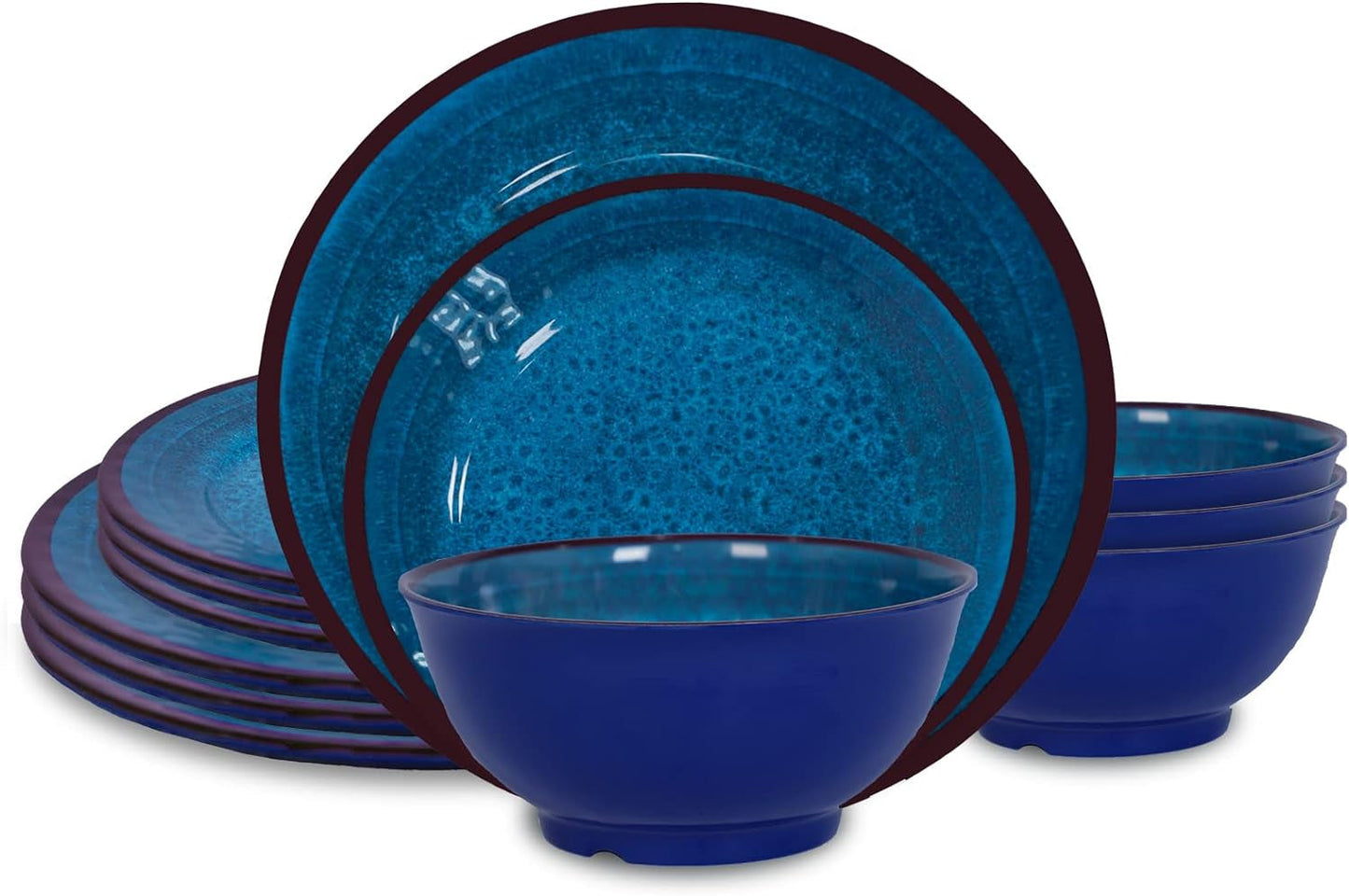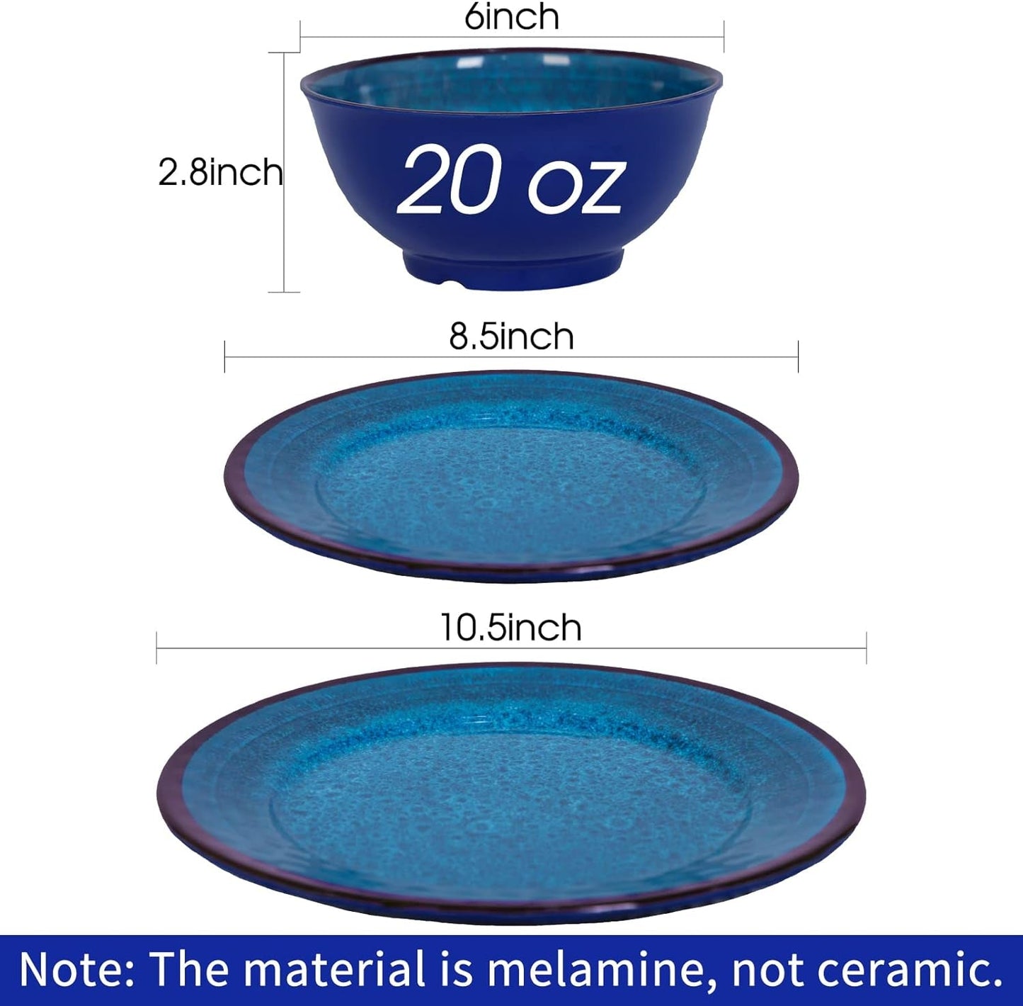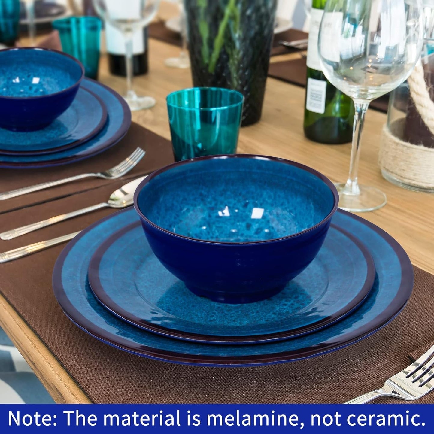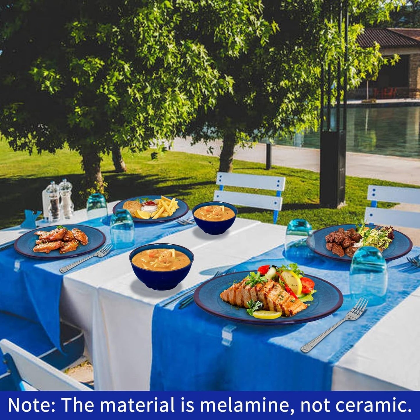 Blue Melamine Dinnerware Sets for 4, Plastic Plates and Bowls Set for 12Pcs, Lightweight Unbreakable Suitable for Indoor/Outdoor Camping Dish Sets, Dishwasher Safe (Blue)