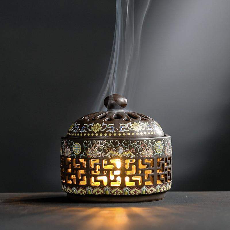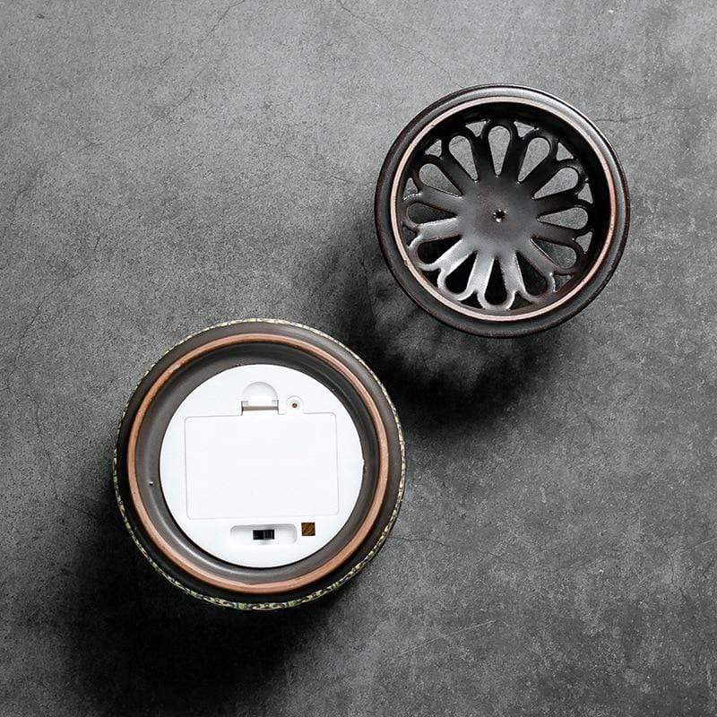 This ceramic handmade incense burner comes with Warm night light. A well-made and attractive addition to living space, decorate your end table or coffee table. (battery not included). Made with elegant lotus flower design, and use hollow-carved design to help with the circulation of air.