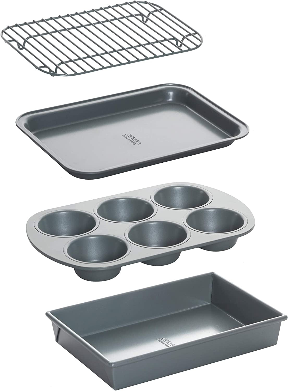 At Chicago Metallic, we believe that serious baking requires serious bakeware. That's why We¡¯re proud to offer distinct lines of premium bakeware, plus stylish, innovative specialty bakeware and baking essentials for professionals and serious home bakers. This professional Series 8-piece bakeware set includes all the essential pans for making your favorite baked goods. Pans are made of heavy-duty carbon steel with a nonstick coating for easy release. 8Piece Set includes: loaf pan, two 14-3/4 x 9-3/4 inch baking sheets, 12-Cup muffin pan, two 8-inch round pans, 16-1/2 x 11-1/2 inch cooling rack, and 9 x 13 inch cake pan. Dishwasher safe; hand-washing recommended to extend the life of the products.