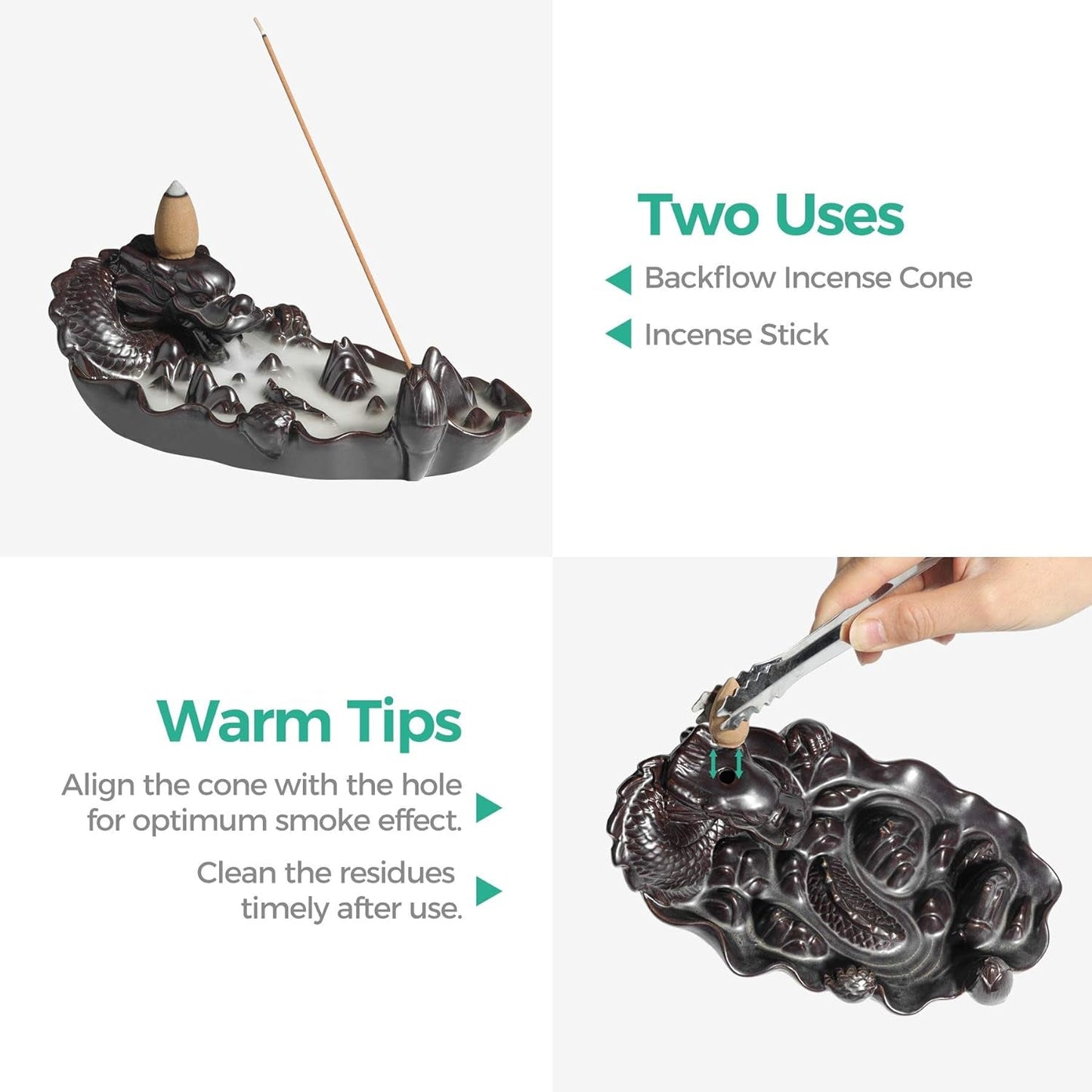 - [Misty Fairyland] Placing a lighted incense cone on the head of the dragon, the smoke flows from its mouth and shrouds the rolling mountains like mist, creating a peaceful and mysterious scene of wonderland to alleviate your anxiety and fatigue.