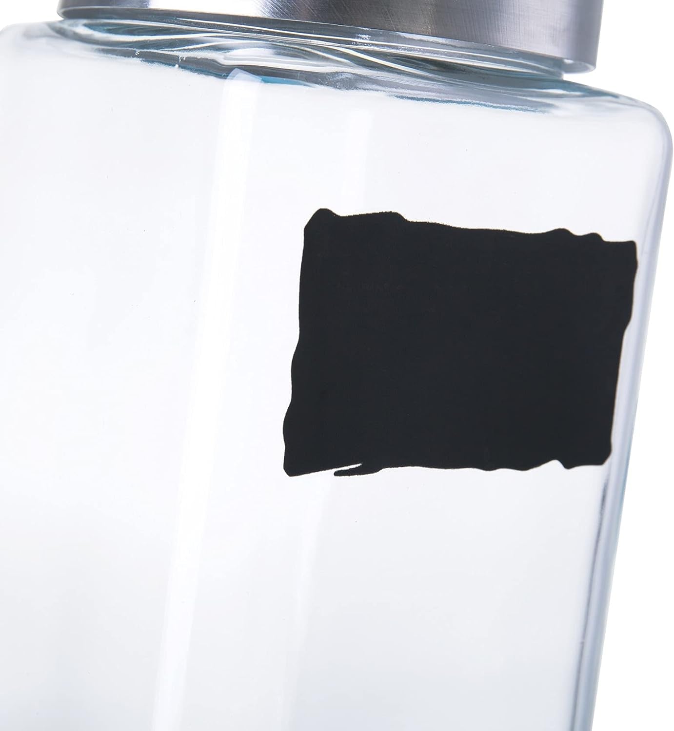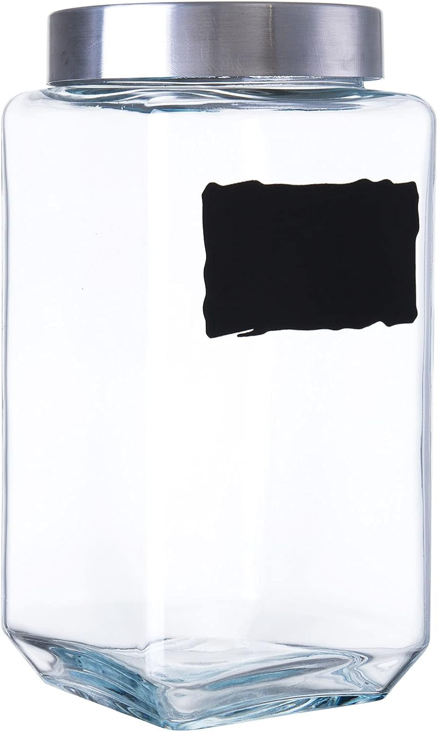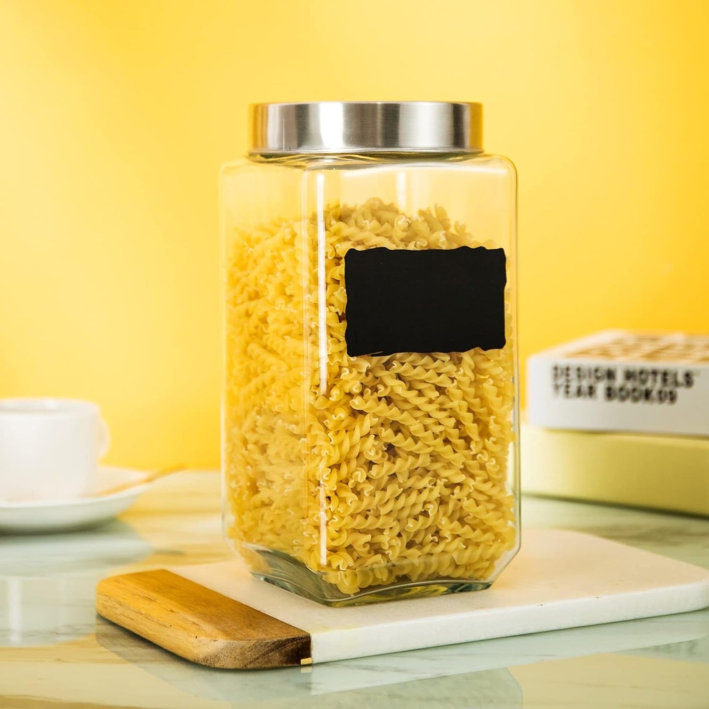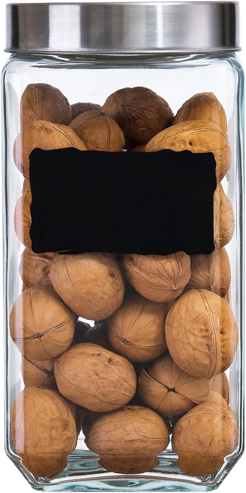 | The metal lid with a rubber ring attached. Not easy to rust, good sealing. | Wide mouth design, mouth diameter is 4 inches. Easy access and cleaning. | A rectangular chalkboard is attached to the jar to mark the contents of the jar. | Made of clear lead-free glass. Square shape, thickened bottom, placed safely. |