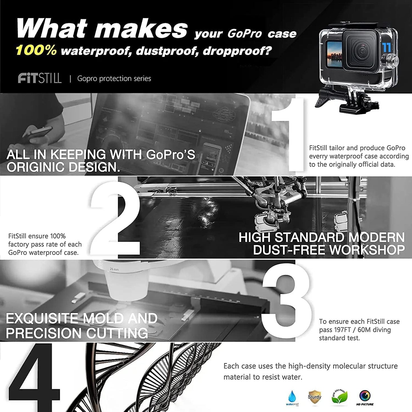 THICKER & STRONGER0.4" BIGGER and 35% THICKER than the standard's housing. | LARGE FLAT GLASS LENSDelivers maximum image sharpness above and below water. | 197FT/60 METER WATERPROOF CASEWith waterproof seal, tight buckle, strong and sturdy case, deeper protection for your Go Pro Hero 9/10/11/12 Black up to 197FT/60 when deep diving. Without this Go Pro Hero 9/10/11/12 Black waterproof case, your Go Pro Hero 9/10/11/12 Black can only be used for 10 meters underwater. |