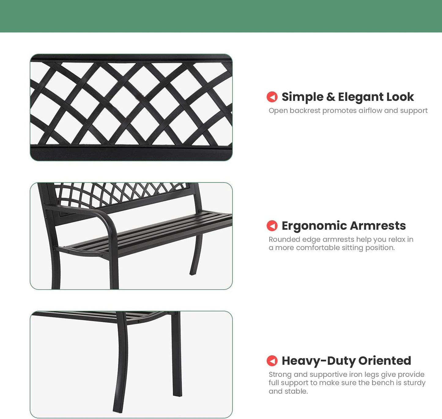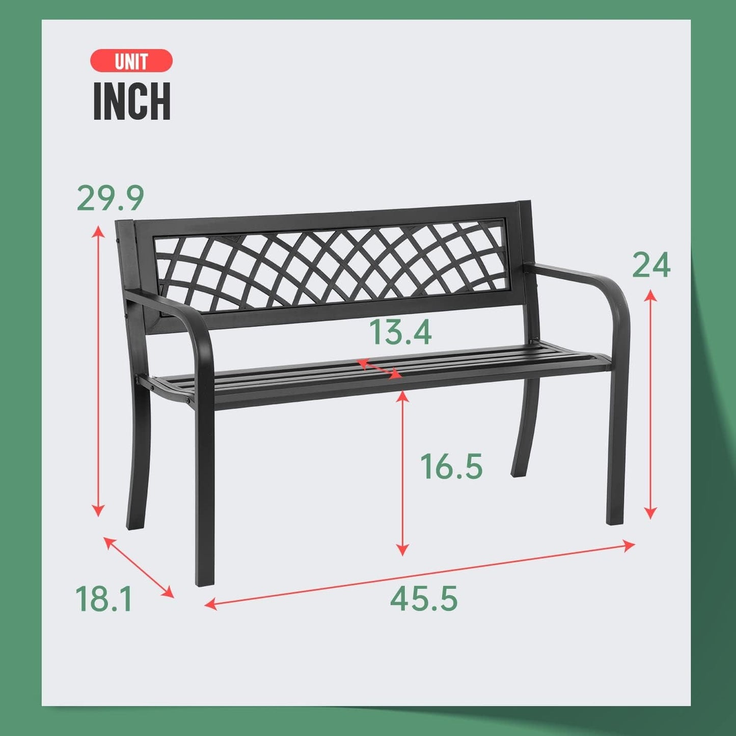 - 🌞【Excellent Design & Perfect Size】The lively and exquisite grid embellishments of the Garden Bench are distributed on backrest fashionable plastic backrest and make whole Metal Bench look beautiful. Not only does the Yard Bench offer comfortable sitting experience but also serve as a good decorative ornament. And the garden bench size perfect for two adults.Garden Bench Patio Bench Yard Bench Park Bench Metal Bench outdoor benches clearance.