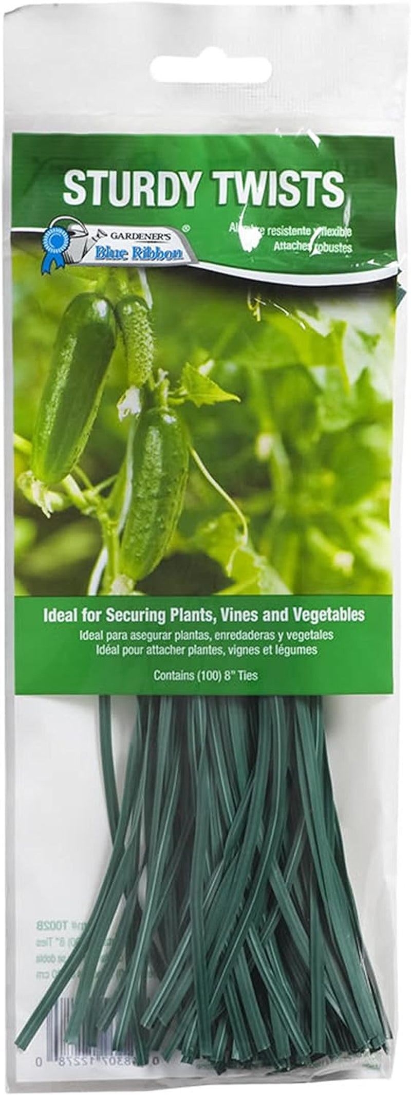 These Gardener's Blue Ribbon sturdy plastic twists can be used to secure plants, vegetables, & vines as they develop in your garden. Colored green to hide their presence in vegetation, these strong & sturdy twist ties are easy to secure to your plants. Consider these twists as an essential garden tool & you'll thank yourself for carrying them out into the garden. A few quick twists will secure nearly any plant in place. Each twist measures 8" & is constructed of plastic-coated wire.