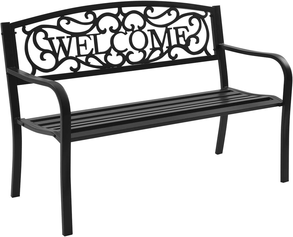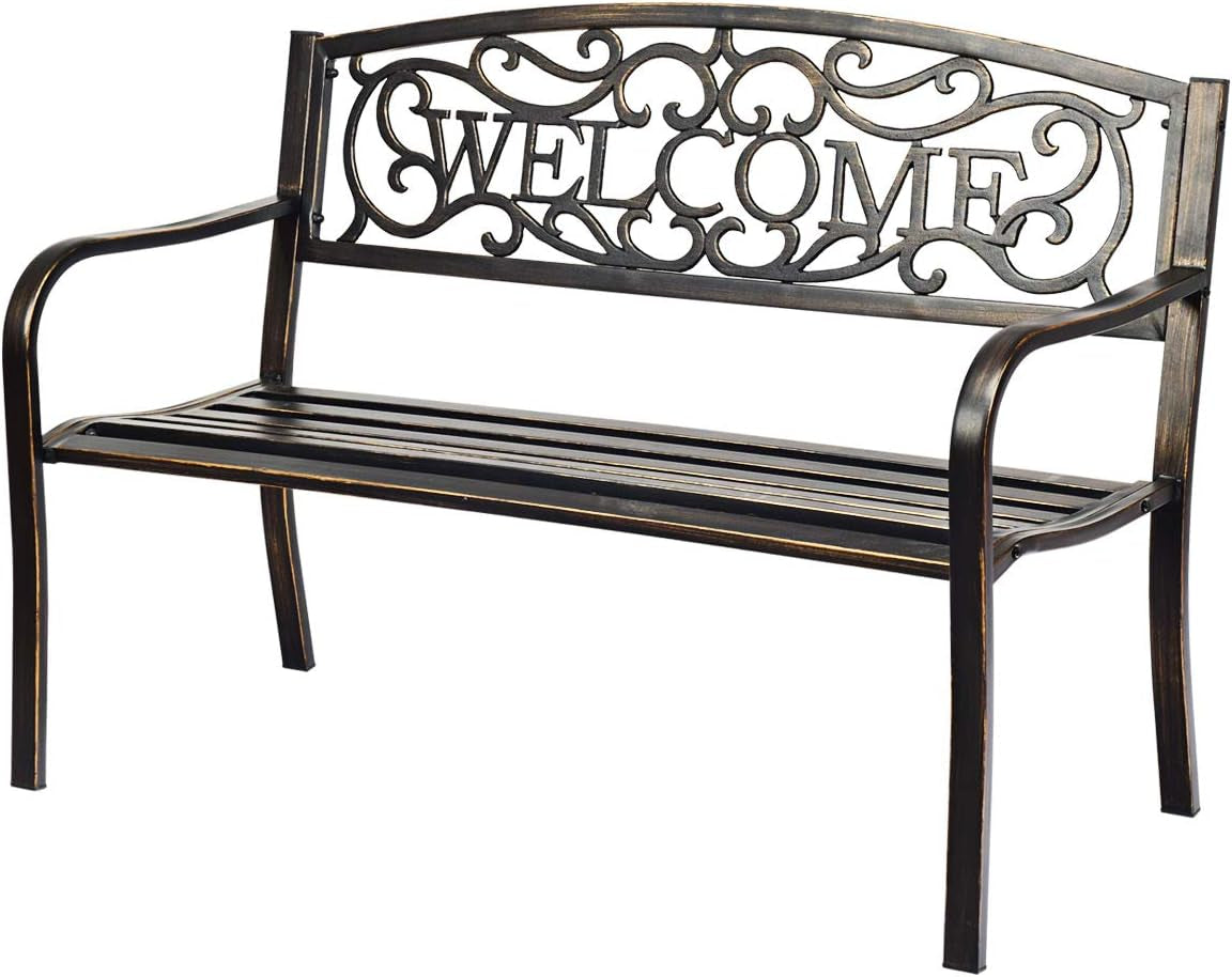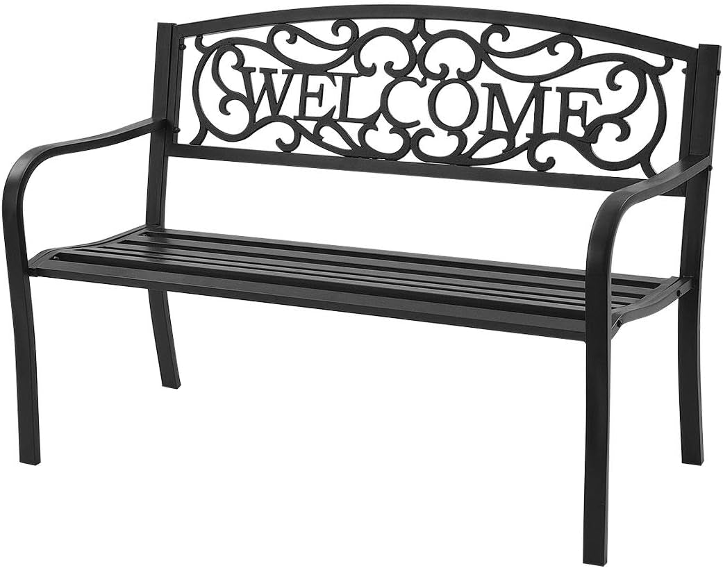 Giantex Garden Bench, Antique Metal outside Bench W/Warm Welcome Pattern, Elegant Bronze Finish and Durable Iron Frame for Park Yard Porch Chair (Black)