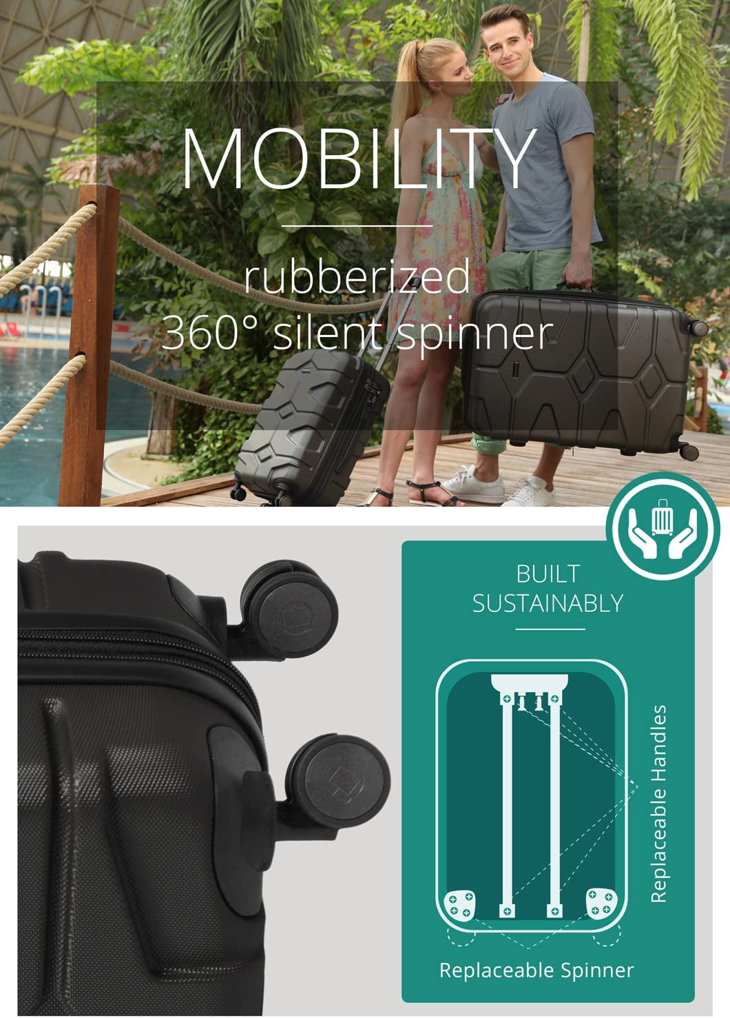 - The ergonomic and fully retractable telescopic handle with a push button is adjustable to three levels, ensuring an upright posture at all times. High rolling comfort is guaranteed by 4 rubberized, 360° rotating double wheels. The handle on top of the suitcase allows effortless carrying at any time.